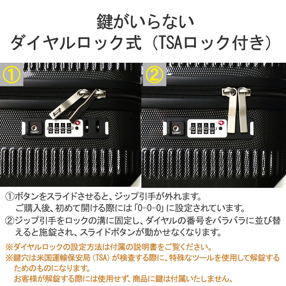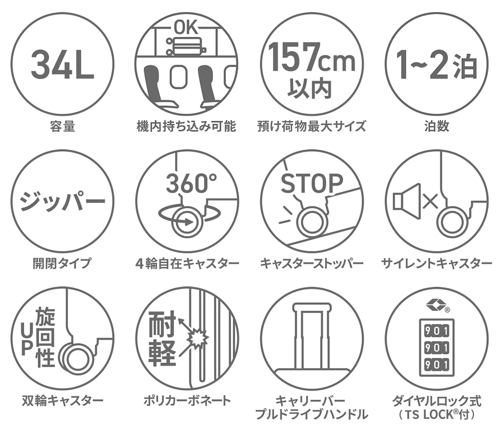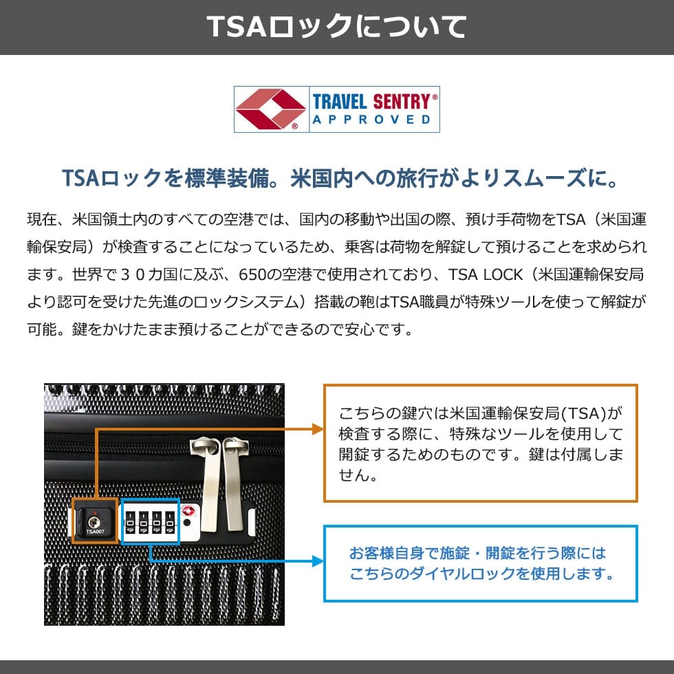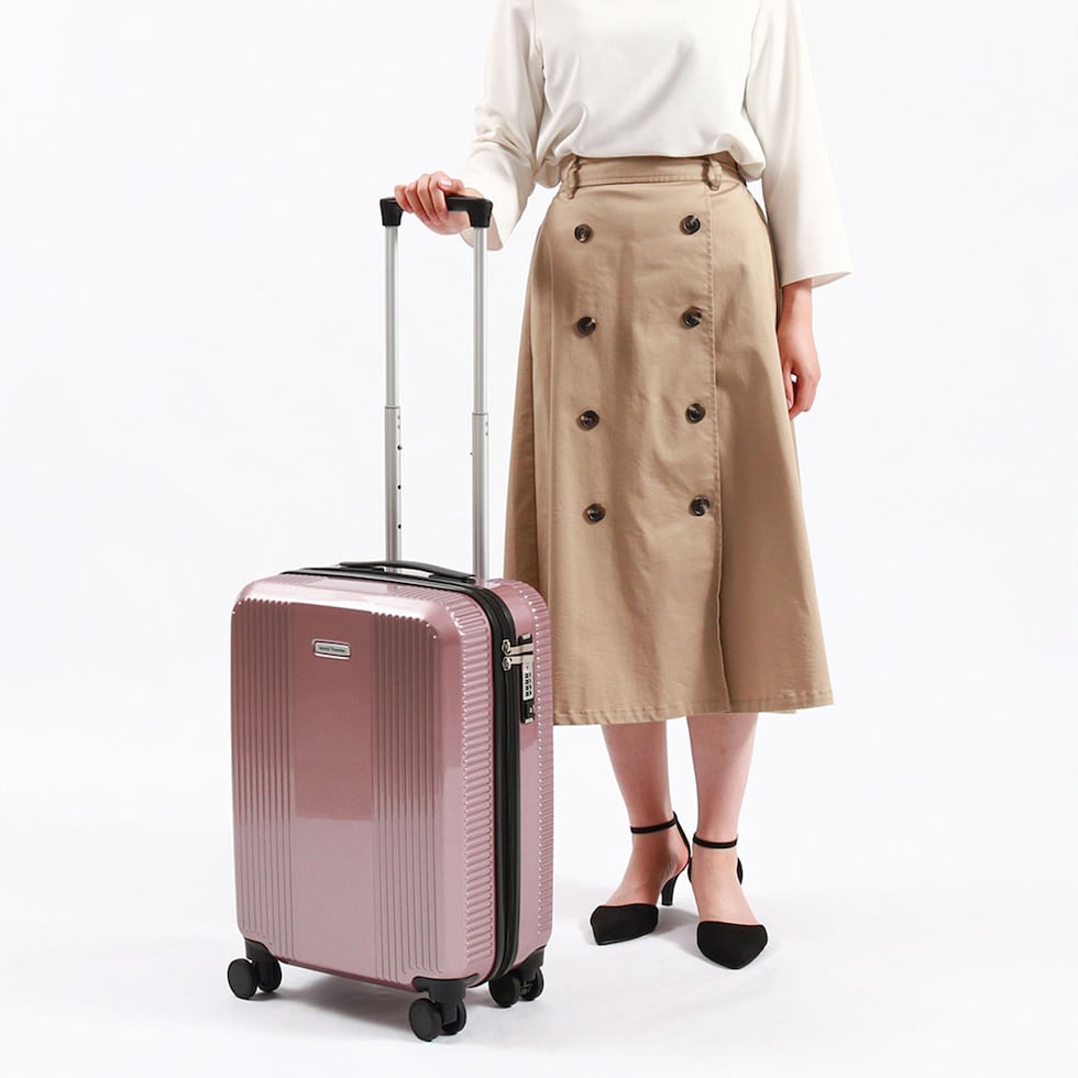 縦リブにカーボン柄を施したシャープなデザインが特徴の『ボトムベイ』シリーズ。本体は1~2泊分の荷物が収まるコンパクトなサイズ感で、旅行や出張などに持ち運びやすいアイテムに仕上がっています。静音双輪キャスターを採用し、静かで安定した走行を実現。また背面にはワンタッチで操作できるキャスターストッパーを装備し、電車や坂道での不意な移動を防止します。その他、TSAロック、耐衝撃性に優れたポリカーボネートをボディに使用するなど、実用的な機能を抑えた設計が魅力です。