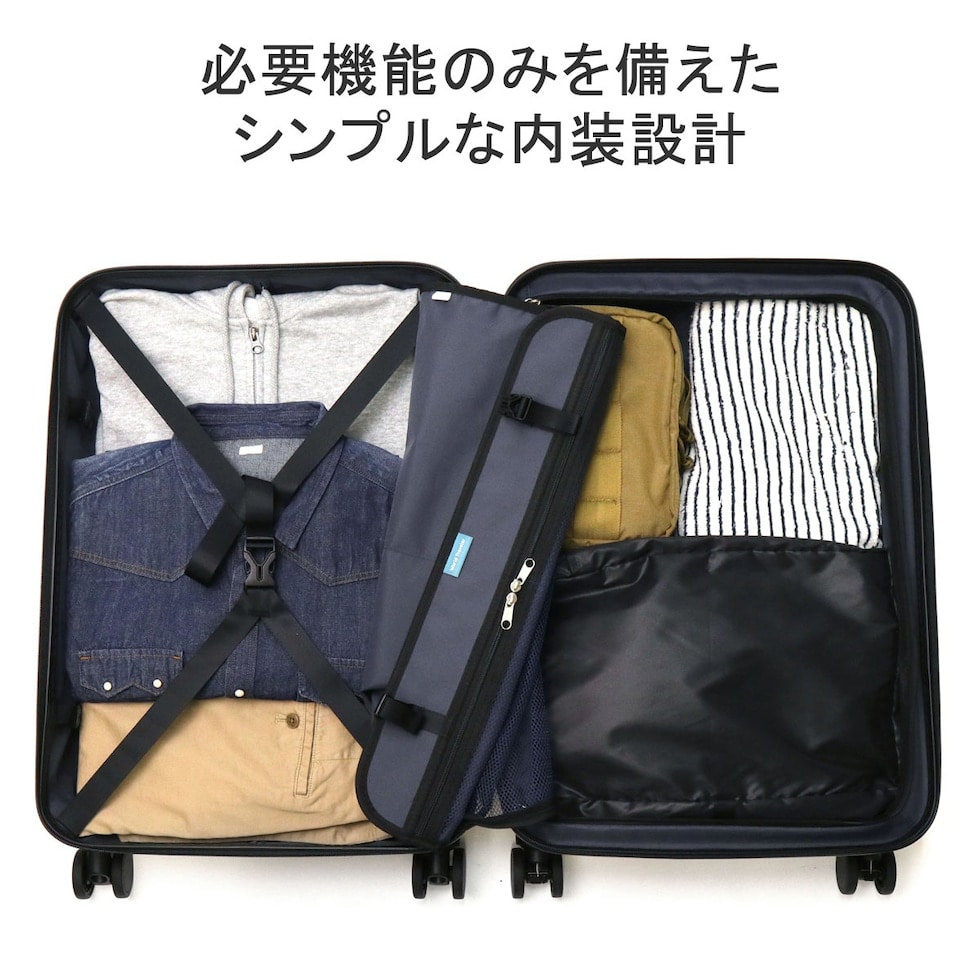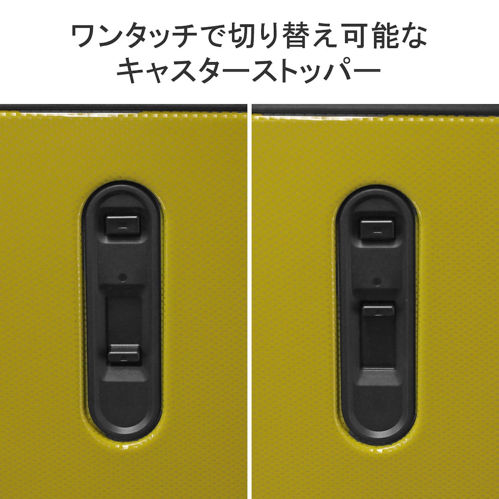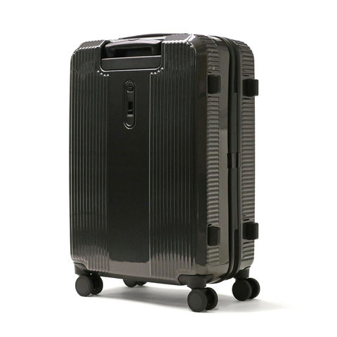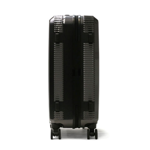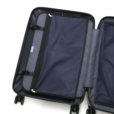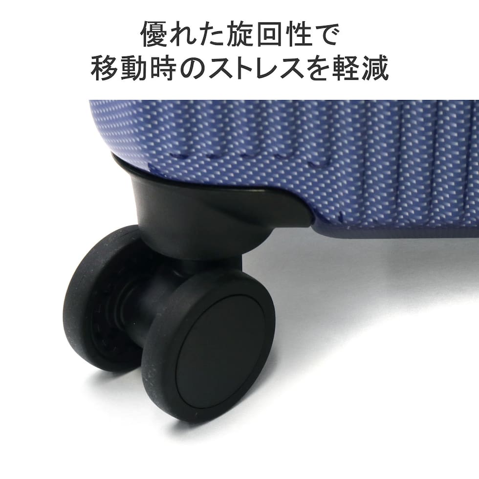 縦リブにカーボン柄を施したシャープなデザインが特徴の『ボトムベイ』シリーズ。収納部は3~5泊程度の旅行に適したサイズ感で、荷崩れしにくいシンプルな内装に仕上がっています。静音双輪キャスターを採用し、静かで安定した走行を実現。また背面にはワンタッチで操作できるキャスターストッパーを装備し、電車や坂道での不意な移動を防止します。その他、TSAロック、耐衝撃性に優れたポリカーボネートをボディに使用するなど、実用的な機能を抑えた設計が魅力です。