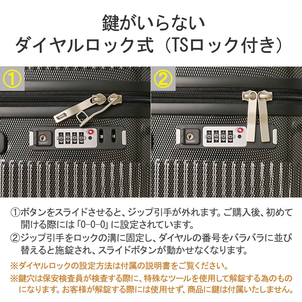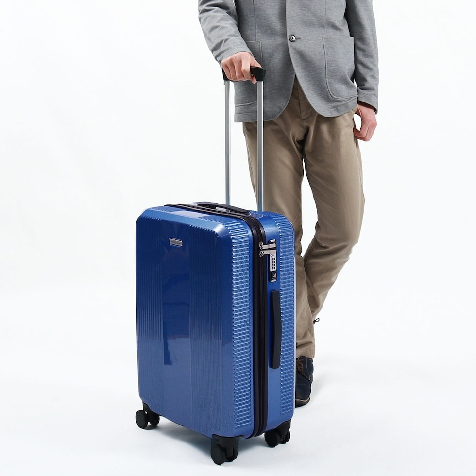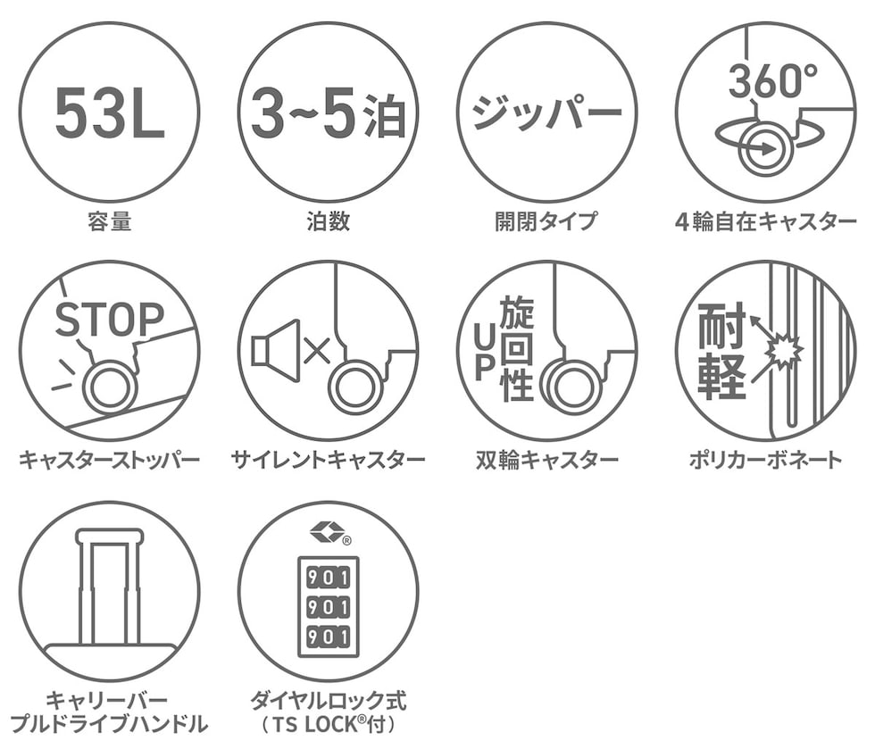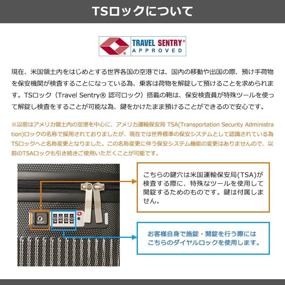 縦リブにカーボン柄を施したシャープなデザインが特徴の『ボトムベイ』シリーズ。収納部は3~5泊程度の旅行に適したサイズ感で、荷崩れしにくいシンプルな内装に仕上がっています。静音双輪キャスターを採用し、静かで安定した走行を実現。また背面にはワンタッチで操作できるキャスターストッパーを装備し、電車や坂道での不意な移動を防止します。その他、TSAロック、耐衝撃性に優れたポリカーボネートをボディに使用するなど、実用的な機能を抑えた設計が魅力です。