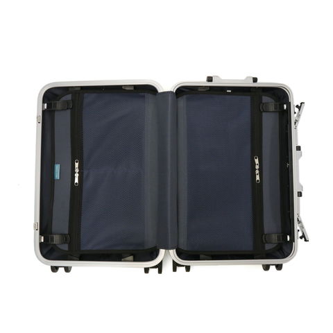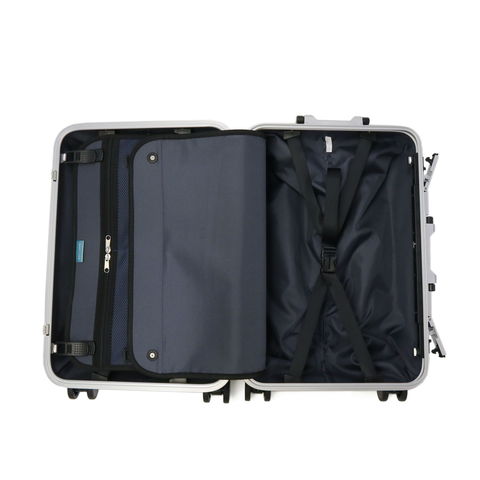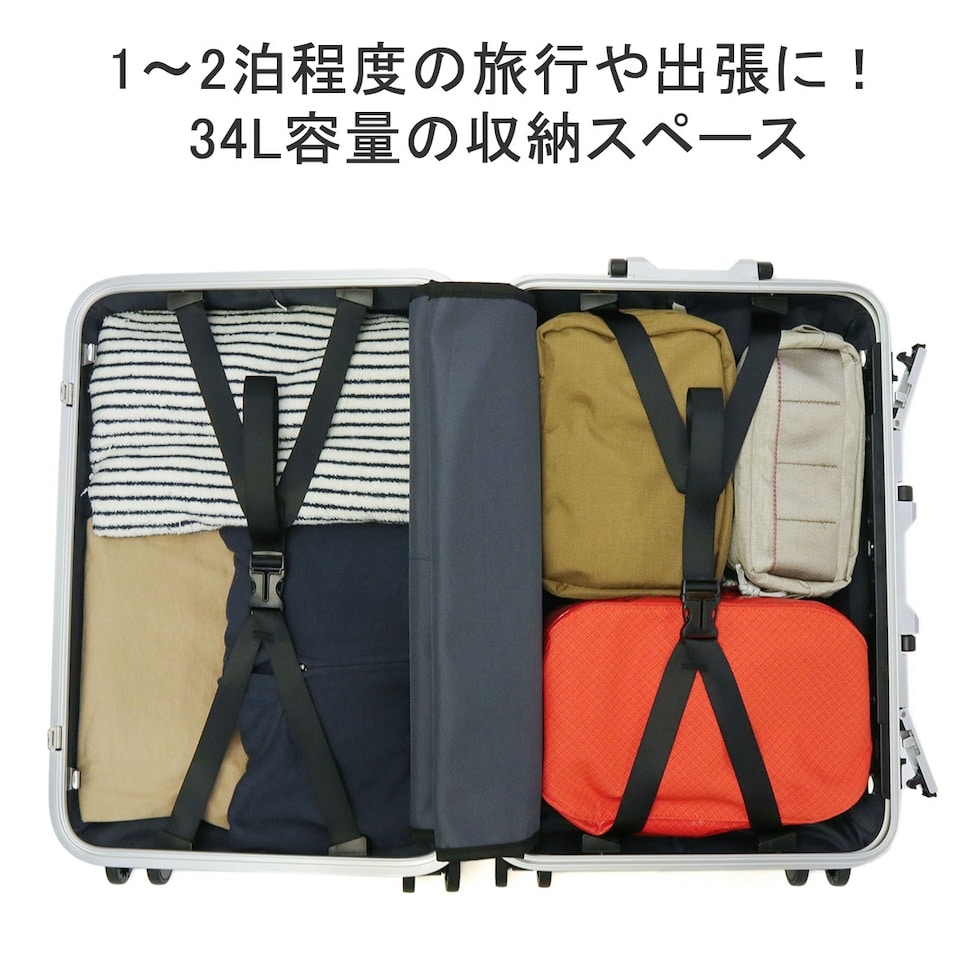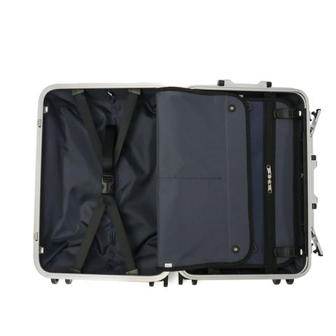 収納部は1?2泊程度の旅行にちょどよいサイズ感。両側にはクロスベルトを搭載しており、収納スペースを確保しつつ荷崩れをしっかりと防止します。ファスナーポケット付きの大きな仕切りが両面に備わっているため、小物の収納に役立つほか、開閉時に目隠しとなるところもポイント。開閉部は頑丈なフレームタイプのため、型崩れしてほしくないスーツや、壊れやすいアイテムを持ち運ぶ際も安心です。