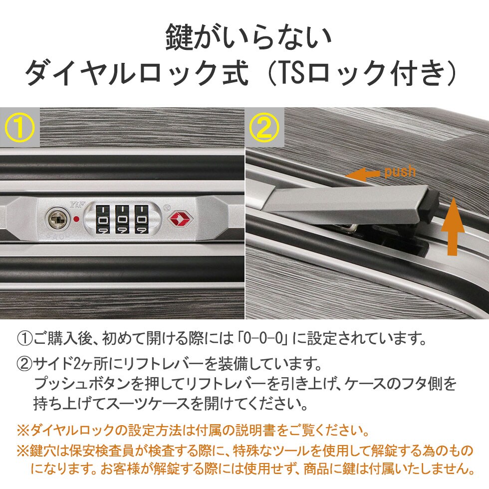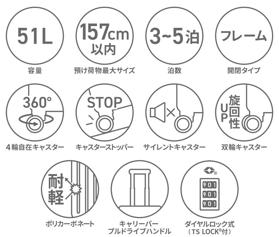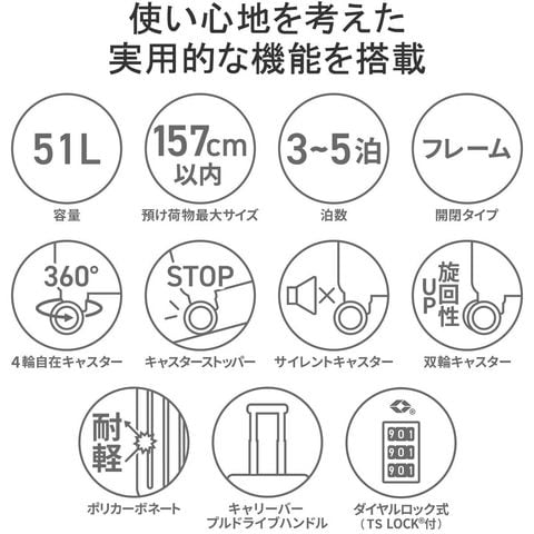 スタイリッシュなリブデザインが美しい『サグレス 2』シリーズ。こちらは、3?5泊程度の旅行に最適な容量51Lタイプです。本体には便利なストッパー機能を搭載しており、背面にあるスイッチを操作するだけで簡単に切り替えが可能。電車やバス、坂道などの移動時に役立ちます。握りやすいハンドルは、手を離すと自動で元の位置に戻るオートリターン式を採用。スムーズに走行する大型の4輪キャスターで、旅先への移動を快適にサポートします。