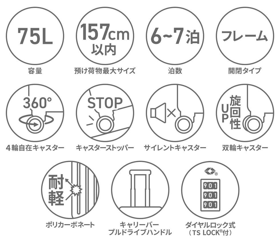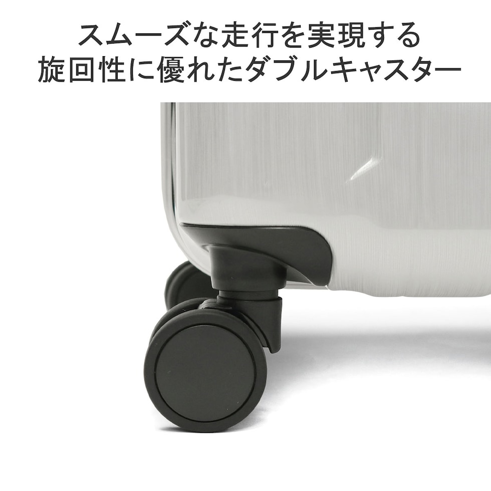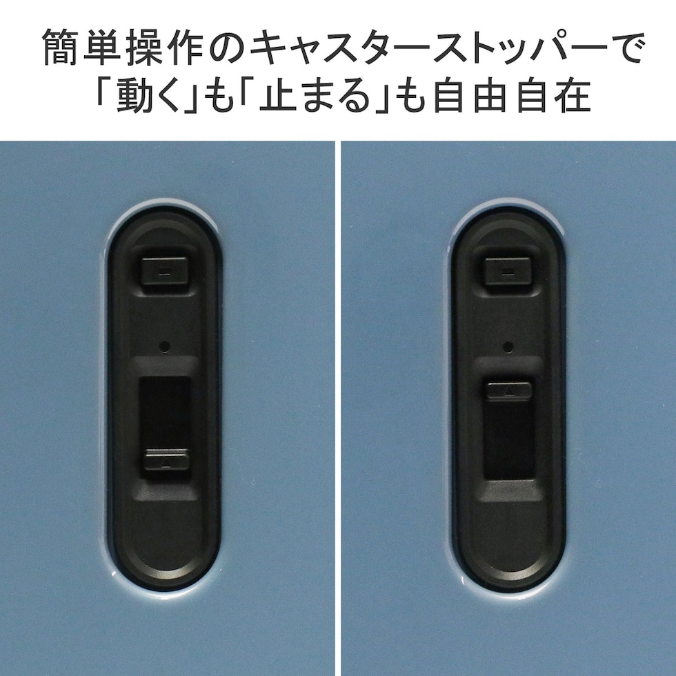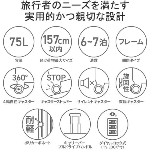 スタイリッシュなリブデザインが美しい『サグレス 2』シリーズ。こちらは、6?7泊程度の旅行に最適な容量75Lタイプです。本体には便利なストッパー機能を搭載しており、背面にあるスイッチを操作するだけで簡単に切り替えが可能。電車やバス、坂道などの移動時に役立ちます。握りやすいハンドルは、手を離すと自動で元の位置に戻るオートリターン式を採用。スムーズに走行する大型の4輪キャスターで、旅先への移動を快適にサポートします。