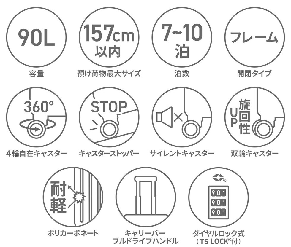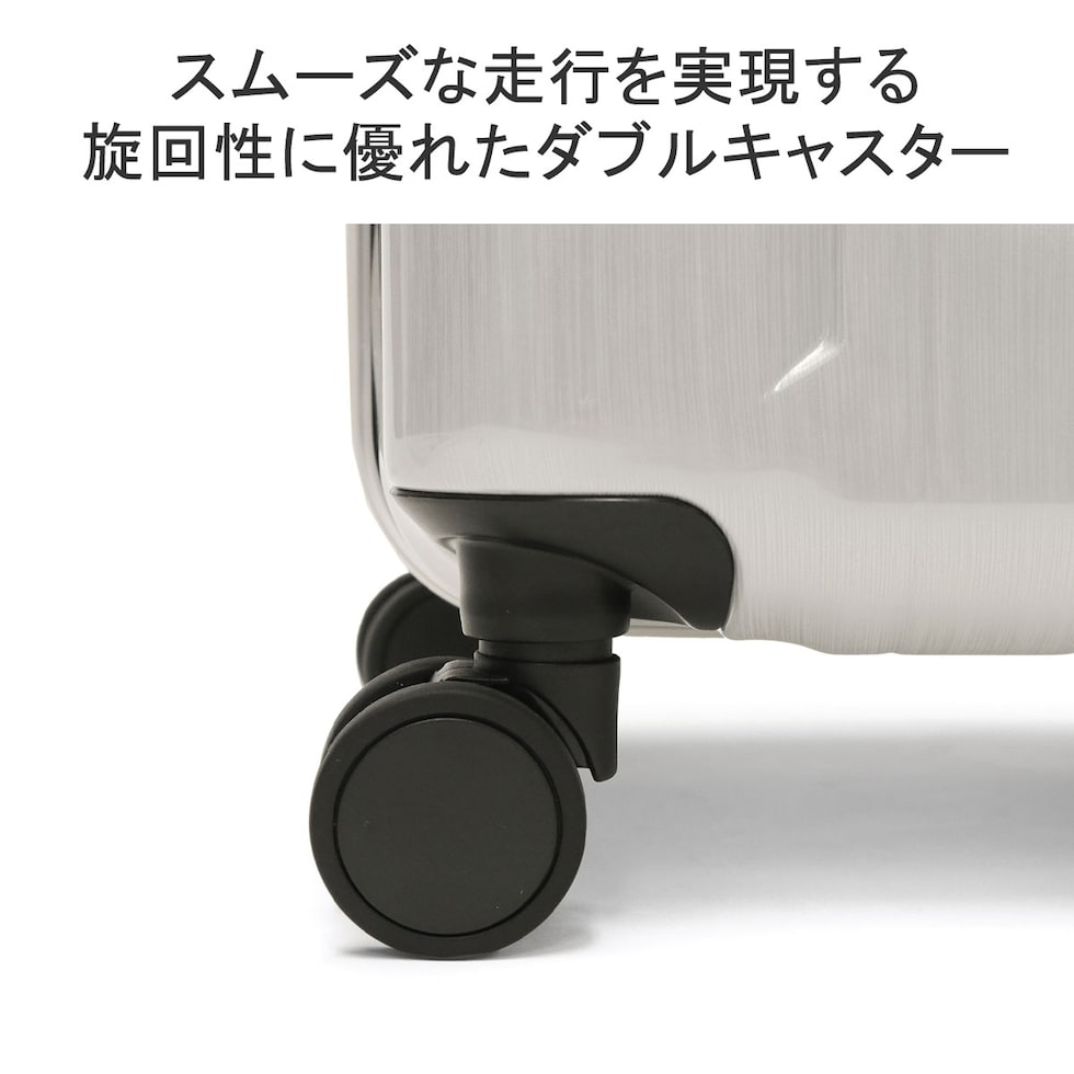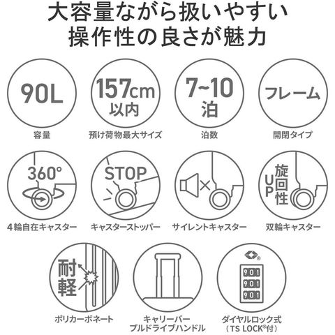 スタイリッシュなリブデザインが美しい『サグレス 2』シリーズ。こちらは、7?10泊程度の旅行に最適な容量90Lタイプです。本体には便利なストッパー機能を搭載しており、背面にあるスイッチを操作するだけで簡単に切り替えが可能。電車やバス、坂道などの移動時に役立ちます。握りやすいハンドルは、手を離すと自動で元の位置に戻るオートリターン式を採用。スムーズに走行する大型の4輪キャスターで、旅先への移動を快適にサポートします。