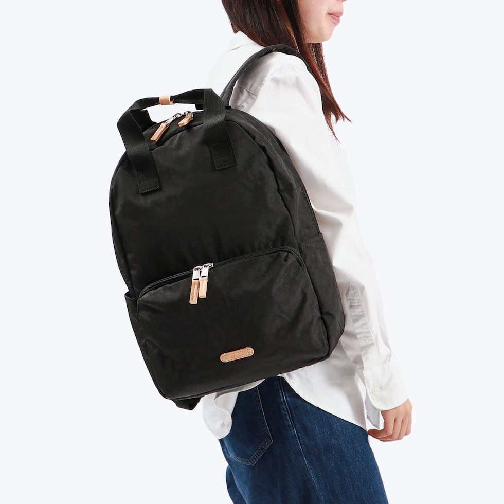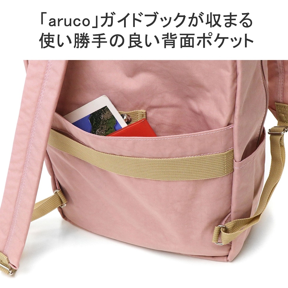 本体には汚れが目立ちにくいワッシャー加工生地を採用し、旅先でもラフに使える仕様が嬉しいポイントです。また、充実したポケットも魅力の一つ。外側背面には「aruco」がちょうど入るサイズのポケットを装備し、いつでもサッと取り出せます。フロントポケットには、ペン差しやキーフック、ホテルのカードキーを差し込めるポケットなどを搭載し、小物類を綺麗に収納できます。さらにスーツケースセットアップ機能も備え、旅を快適にする工夫が満載です。