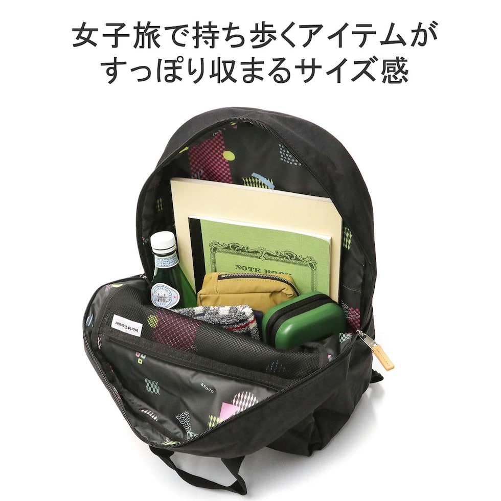 旅行ガイドブック「aruco」とのコラボレーションで生まれた、旅好き女子のための『aruco by WT マイラ』シリーズ。こちらは丸みを帯びたフォルムが可愛らしいリュックです。外装はどんなコーデにも似合うようシンプルに仕上げ、内装には「aruco」の表紙に使われている、人気観光地をイメージしたイラストを採用。旅行の準備段階からワクワクする、可愛くて便利なアイテムです。