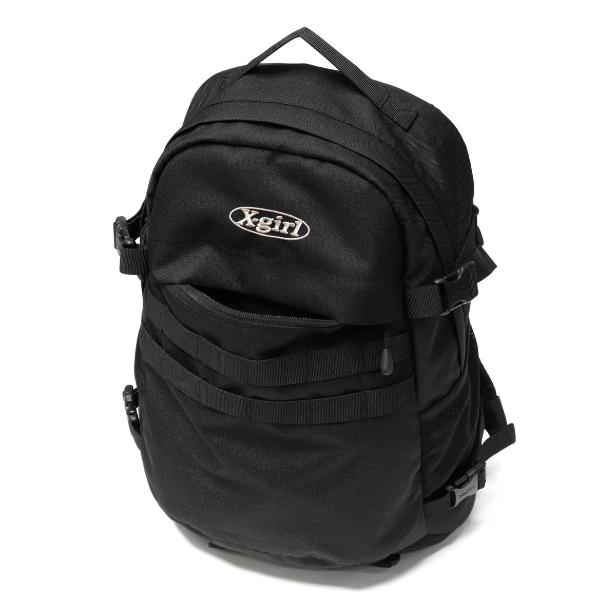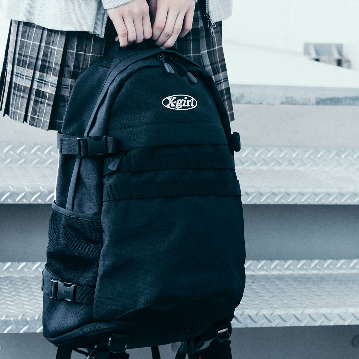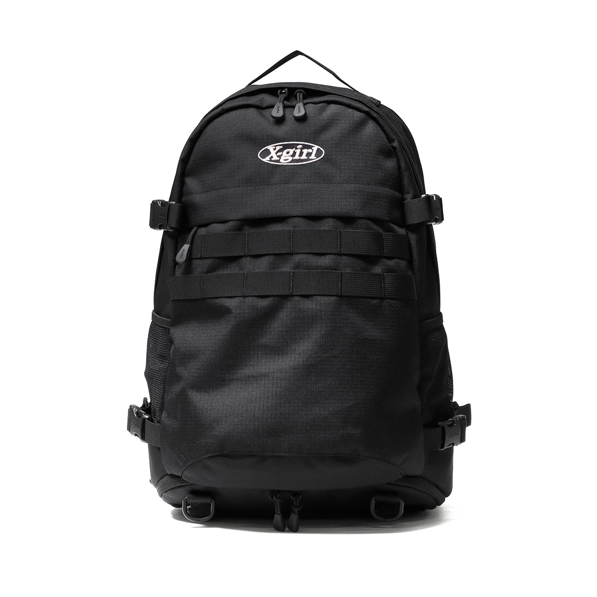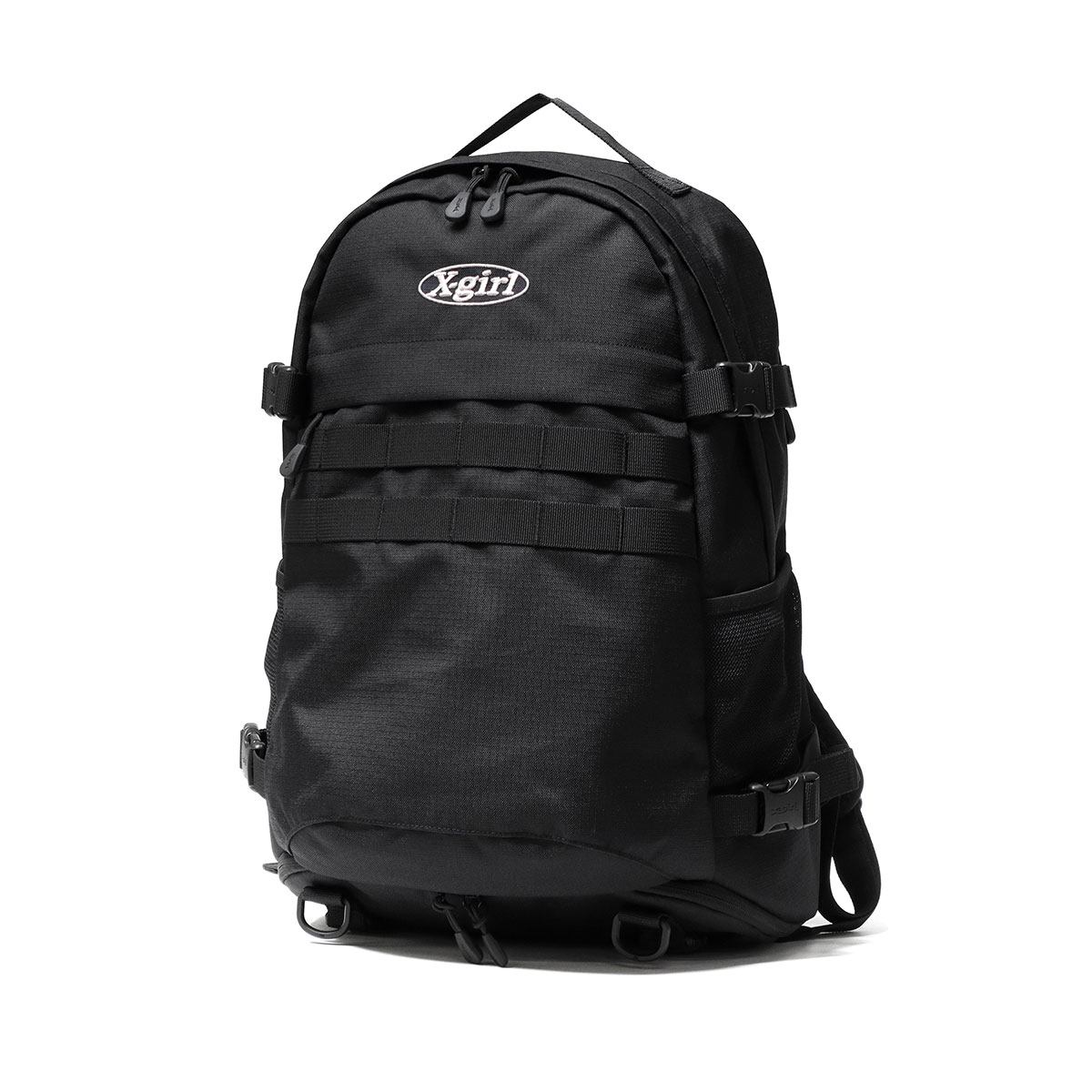 軽量ながらも丈夫なCORDURA素材を使用したX-girl定番のロゴリュック。生地全体に撥水・防汚機能に優れたテフロン加工が施されているので、少々の雨や汚れも気にせずお使いいただけます。可愛さとかっこよさを兼ね備えたブランドらしいデザインが、毎日の通学やお出かけをより楽しくしてくれそうです。