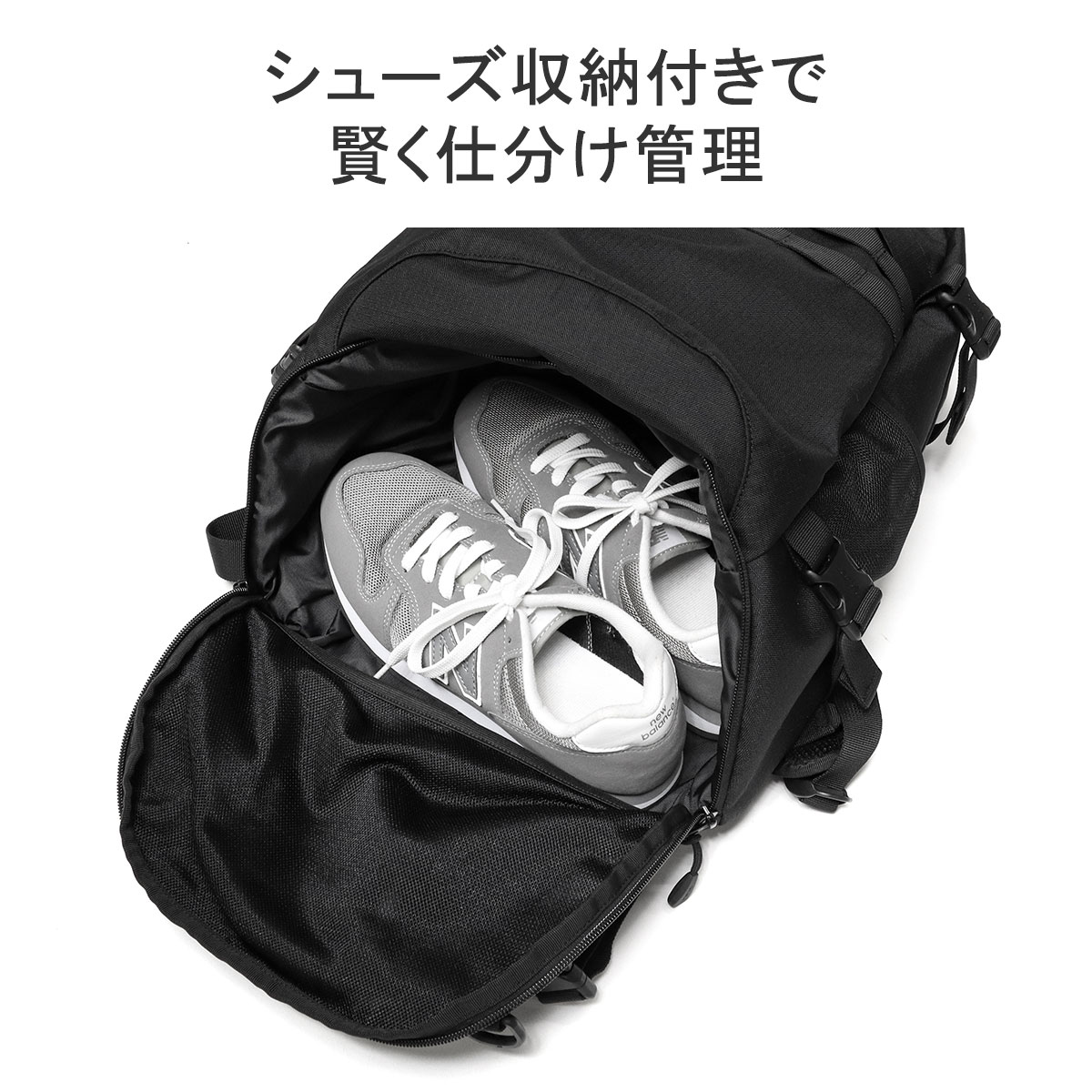 本体底面にはシューズ収納が付いているので、部活やサークル、ジム通いにもおすすめ。使用後のシューズを他の物と分けられるので、においや汚れを気にせずにしまえます。シューズ収納の他にも、内外に小分けポケットを設けており、小物類の整理もばっちりです。