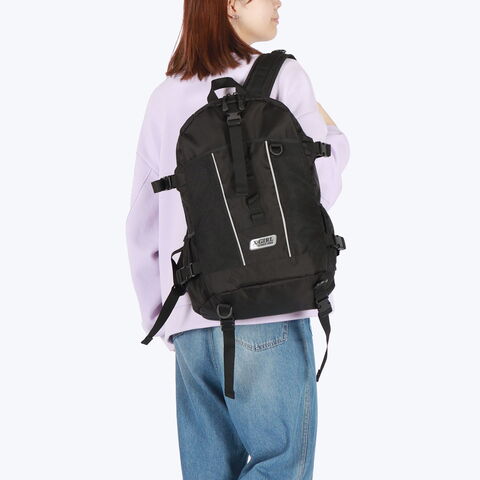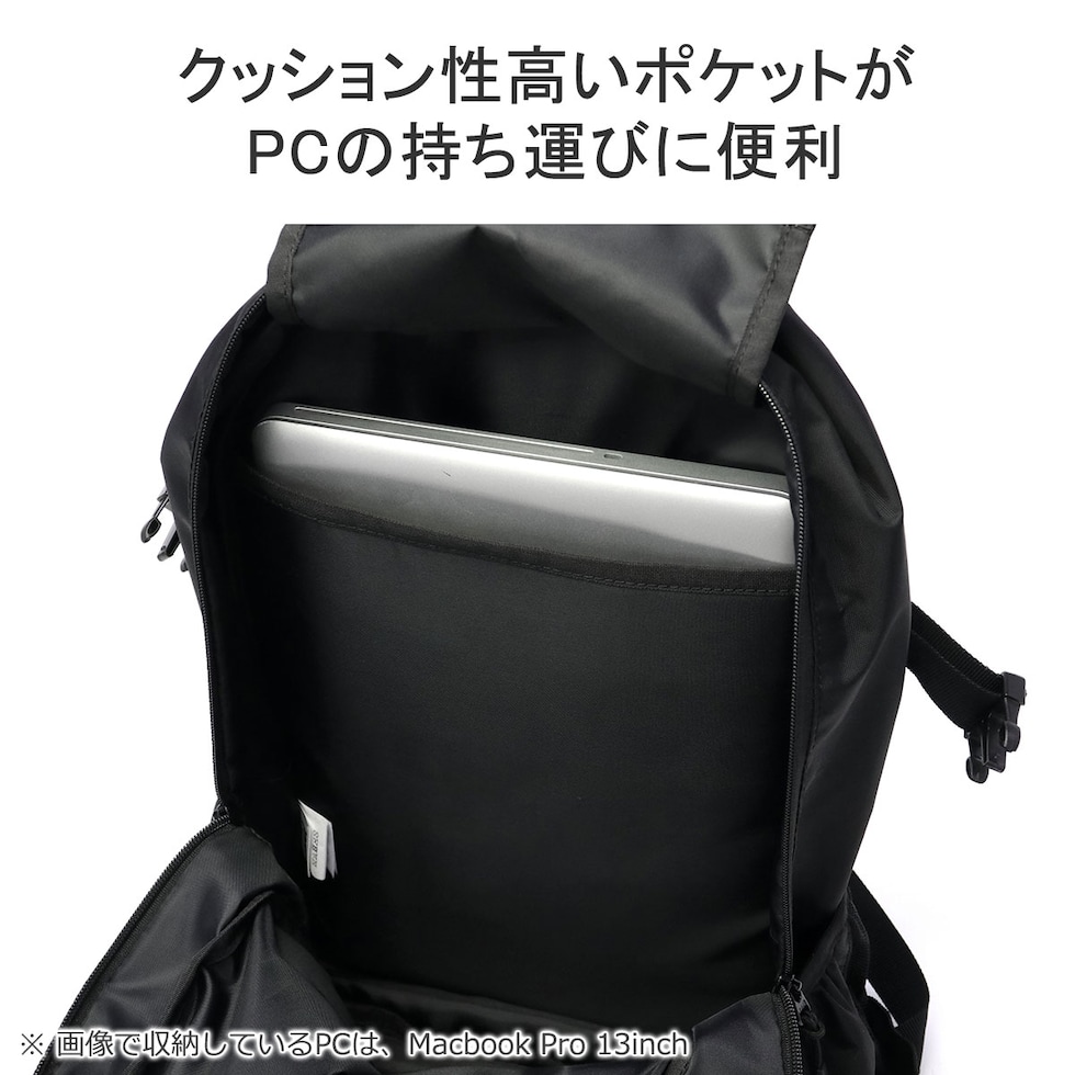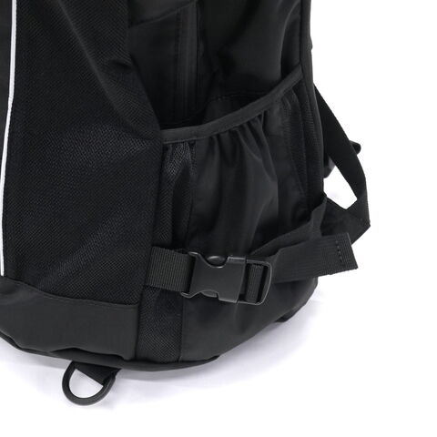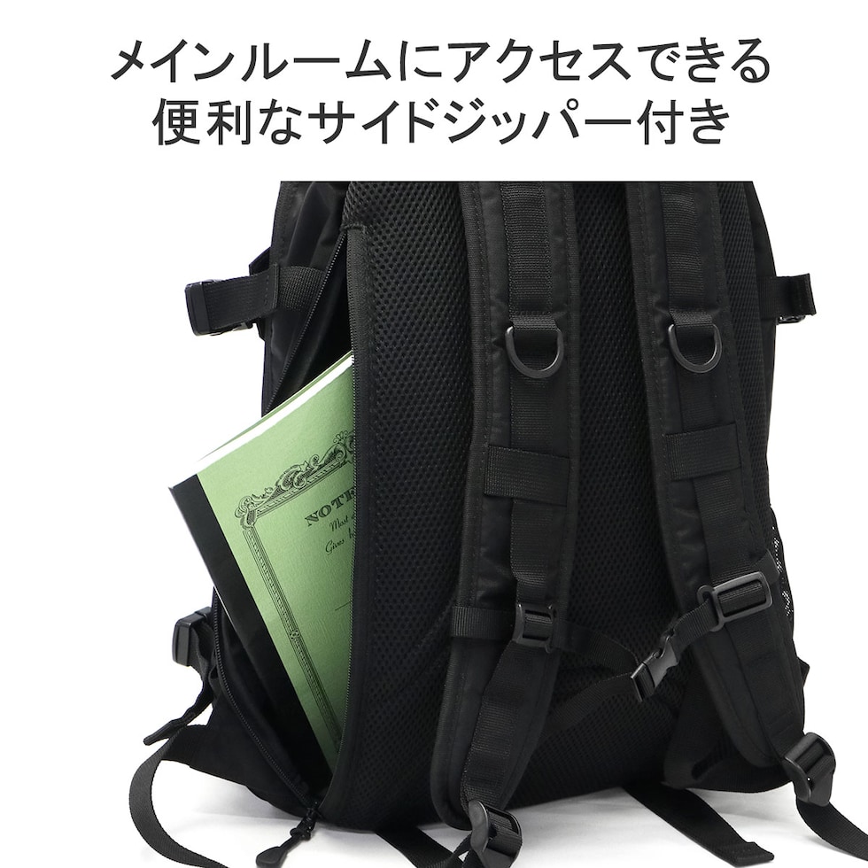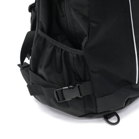 リフレクターコードとX-girlのラバーロゴがアクセントになったバックパック。本体はA4ファイルがゆとりを持って収まるサイズ感で、PCスリーブと中吊りポケットを備えた機能的な設計です。背負ったままサイドから本体内部へアクセスできる便利なジップ付き。軽量ながら30Lと大容量で、普段使いはもちろん、通勤通学や旅行・イベントなど幅広く活躍するアイテムです。