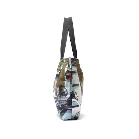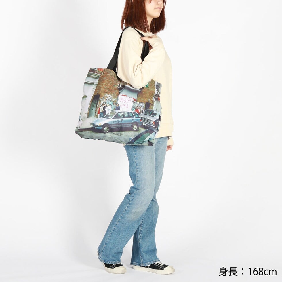 ブランドのヒストリーをのせた存在感のあるデザインが目を惹く収納力抜群のビッグトート。1994年N.Y.のソーホーにて、ストリートの女の子をハントしモデルとしてランウェイを歩かせ、X-girl初のゲリラストリートファッションショーを行った現場が全面プリント写真となっています。コーディネートのアクセントになってくれる個性的な仕上りです。