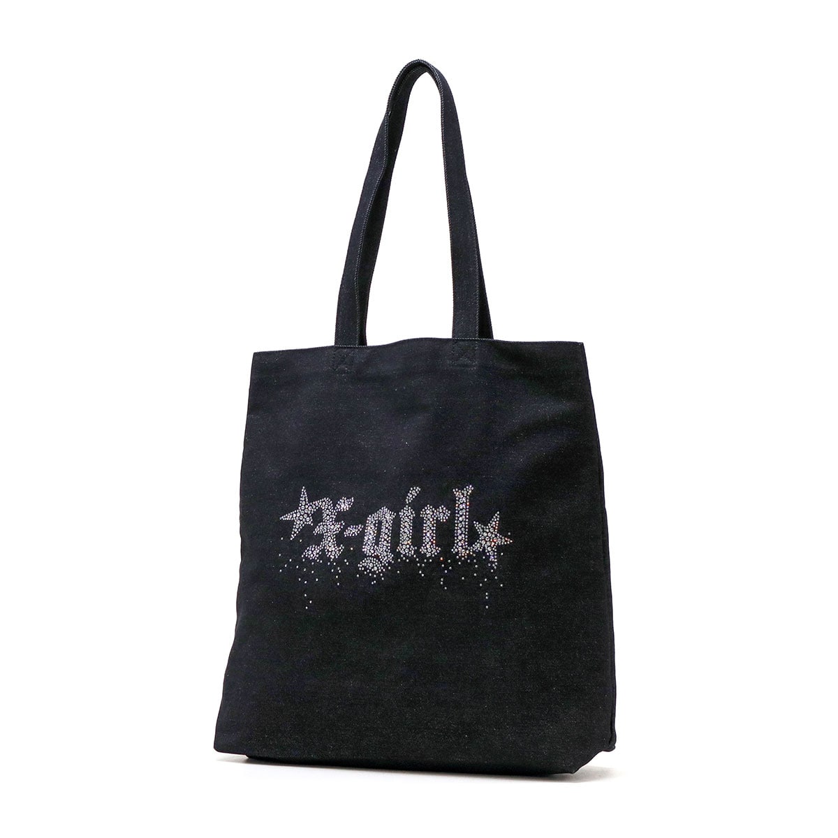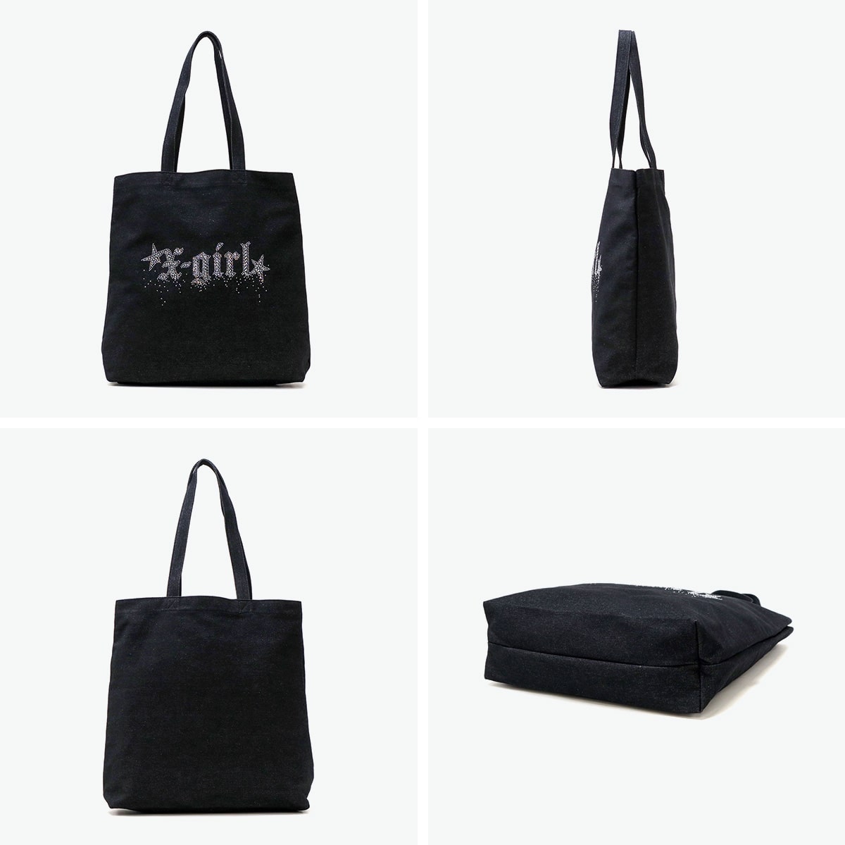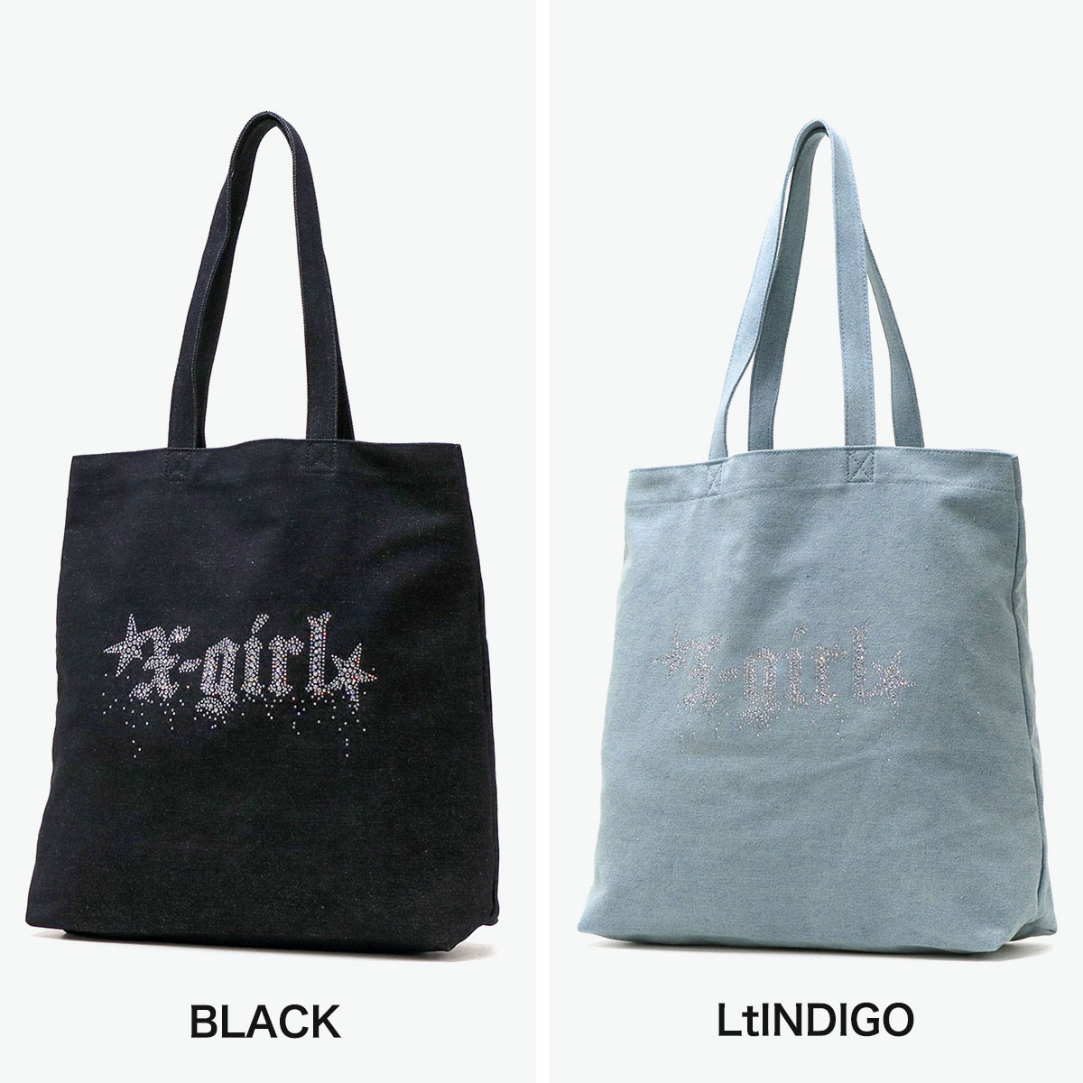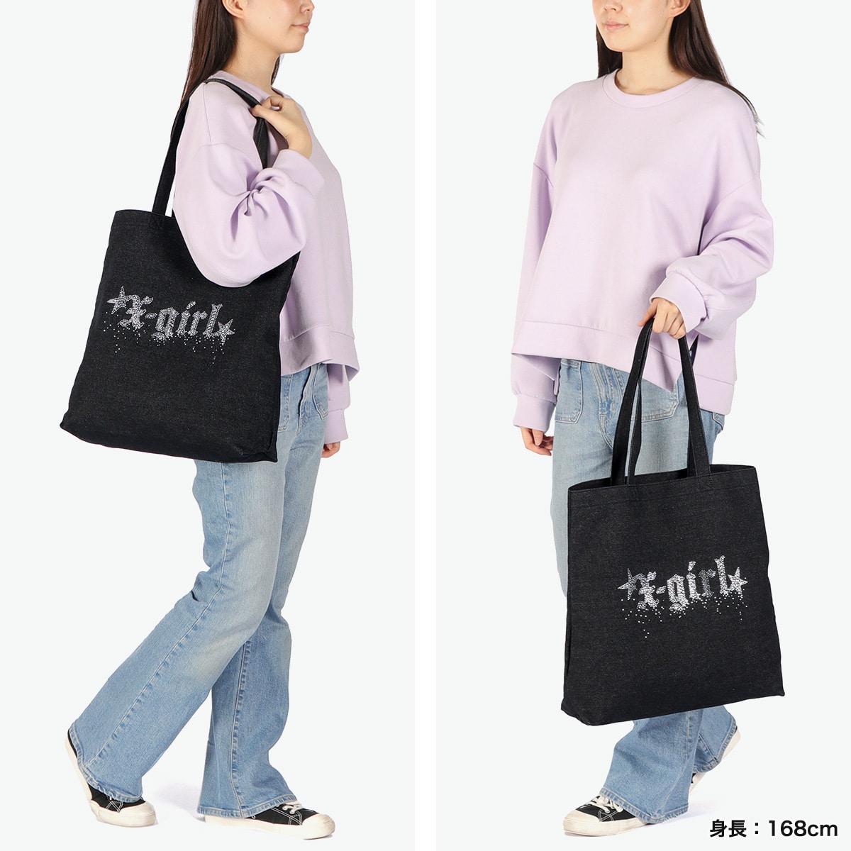 星がきらめくようなX-girlロゴのグラフィックが魅力のトートバッグ。加工感のあるデニム素材と、ラグジュアリーなキラキラのラインストーンデザインをMIXしたトレンドライクな仕上がり。デイリーユースから旅行やレジャーなど、幅広いシーンに活躍するアイテムとなっています。