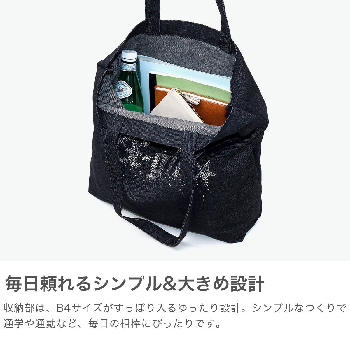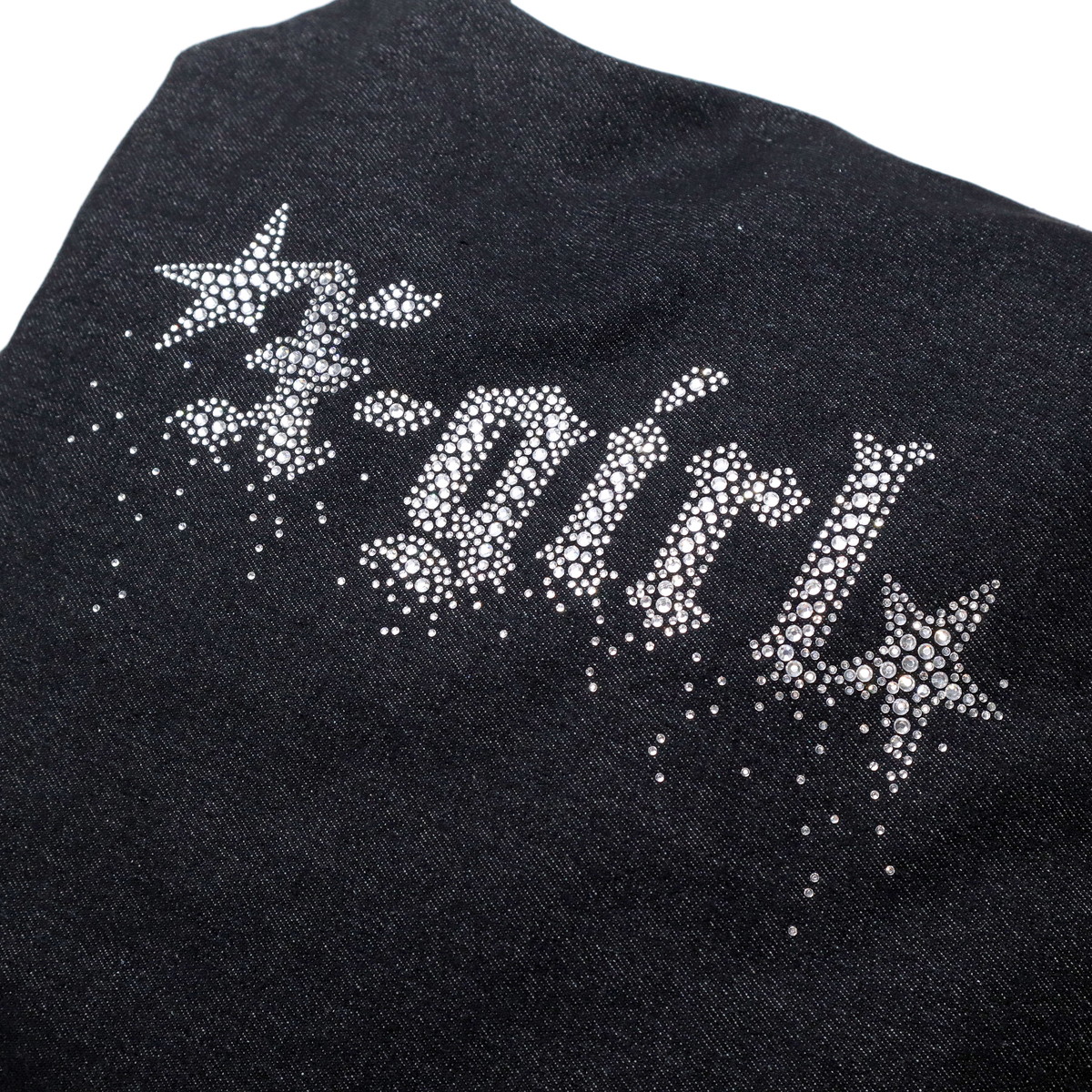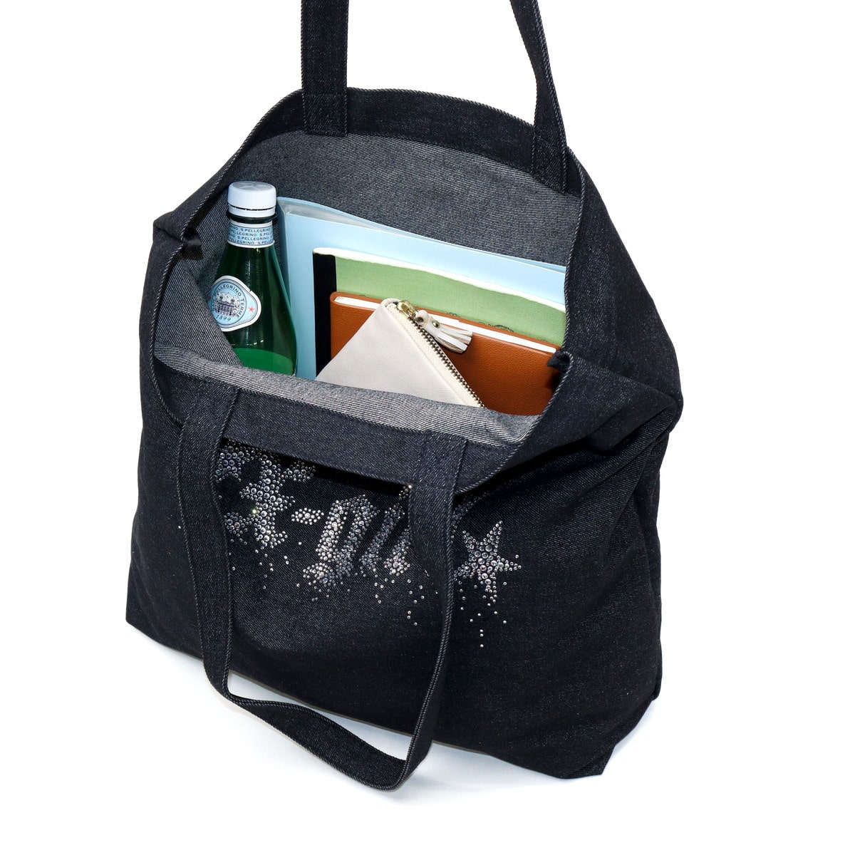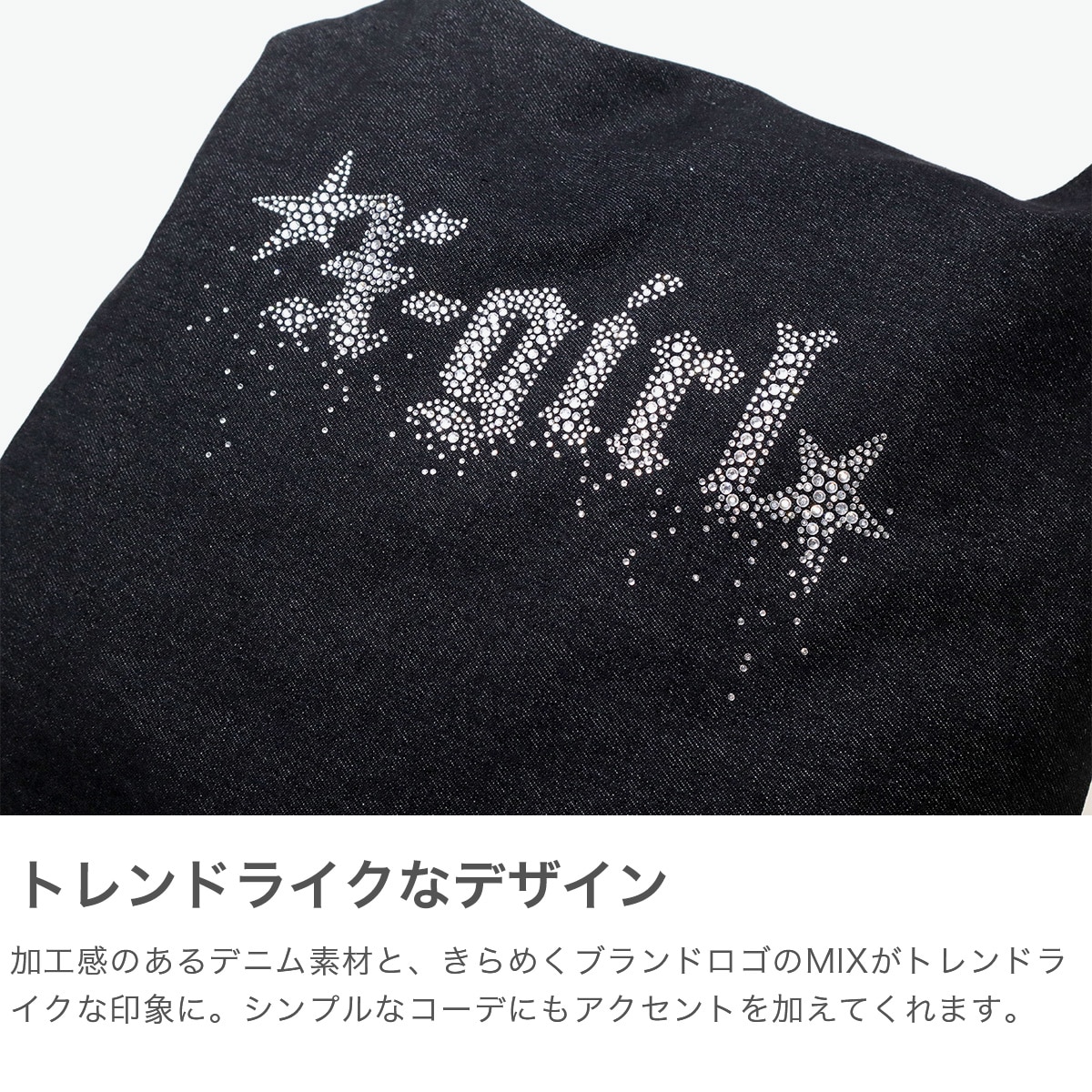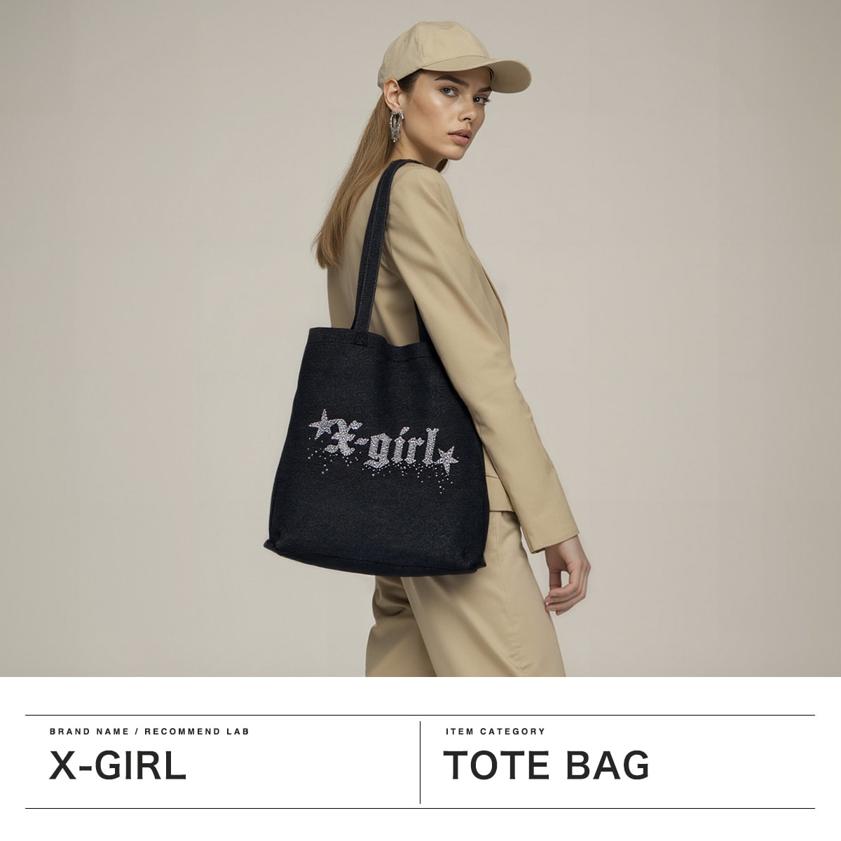 星がきらめくようなX-girlロゴのグラフィックが魅力のトートバッグ。加工感のあるデニム素材と、ラグジュアリーなキラキラのラインストーンデザインをMIXしたトレンドライクな仕上がり。デイリーユースから旅行やレジャーなど、幅広いシーンに活躍するアイテムとなっています。