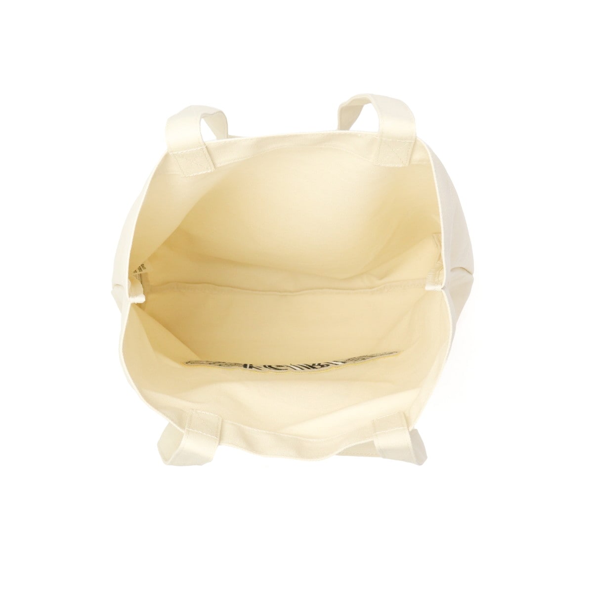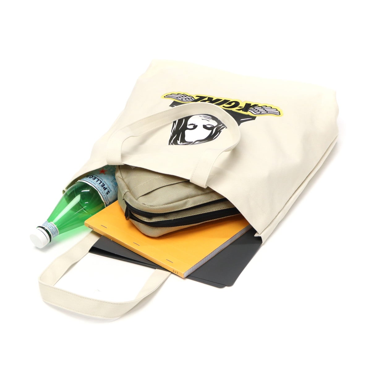 アーカイブのエンジェルFACEロゴグラフィックが目を惹くトートバッグ。グラフィック部分はプリント、ロゴは刺繍パッチを施したミックスデザインが魅力です。軽やかなキャンバス素材で持ち運びやすく、A4サイズが縦横どちらにもすっきり収納可能。通勤・通学はもちろん、旅行やレジャーなど幅広いシーンで活躍します。