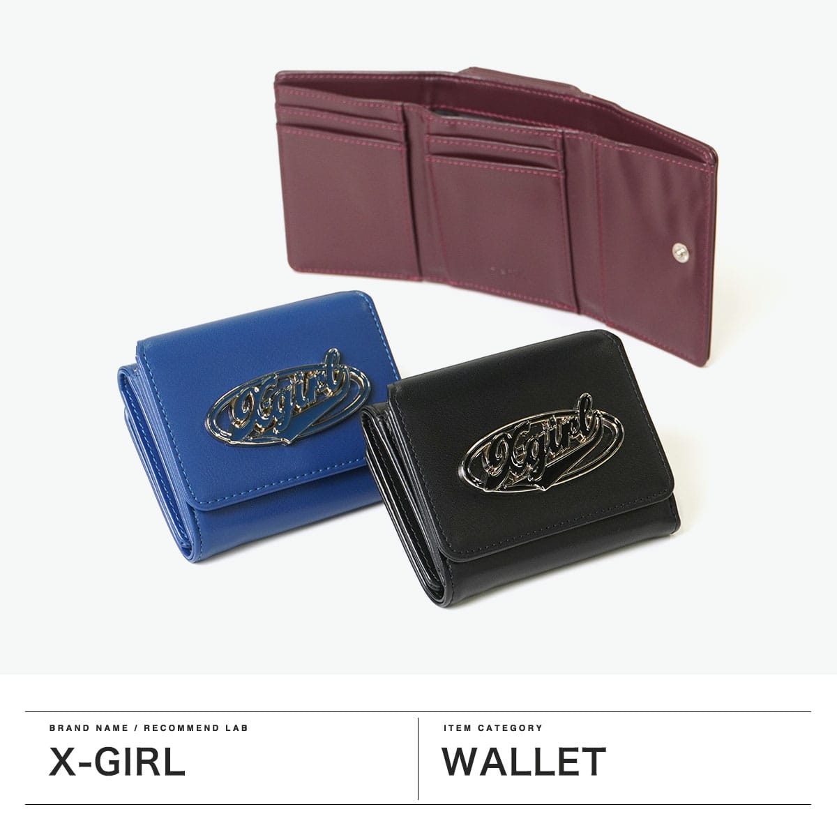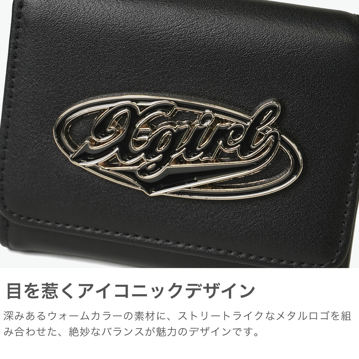 X-girlで大人気のミニウォレット。目を惹くオーバルロゴのバックルと、深みのあるウォームカラーが魅力です。大人っぽいフェイクレザーの質感に、ストリートなメタルロゴを掛け合わせた絶妙なバランスがポイント。コンパクトながら小銭入れやカード収納も充実しており、機能も充実しています。デザインと実用性を兼ね備えたアイテムです。