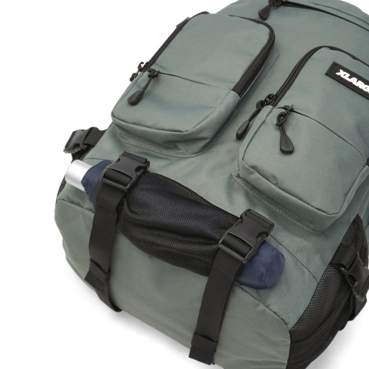 フロントのポケットが特徴的な多機能バックパック。ロゴのラバータッチもさりげないポイントになっており、多数のポケットやメッシュ収納などを備えた使いやすいつくり。通勤・通学などユニセックスで持てる、シンプルながらも『XLARGE』らしい仕上がりとなっています。
