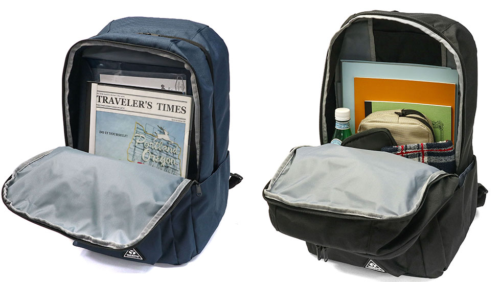メインルームは荷物の仕分けに便利な2ルーム仕様です。どちらのスペースもマチがたっぷりと備わっており、旅行の際には着替えやポーチ、タオルなどの収納も楽々行えます。B4サイズまで対応しているので、ノートやファイル等の持ち運びにも役立ちます。