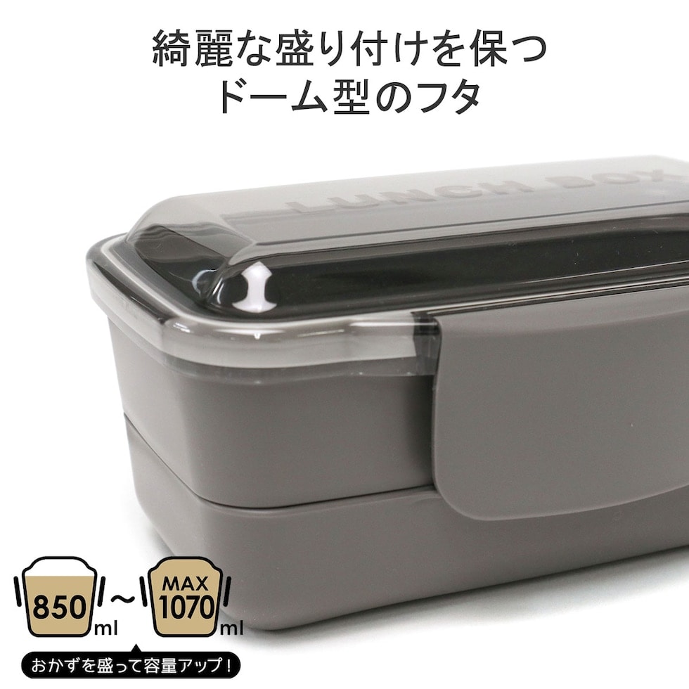 シンプルで少し柔らかい印象の「monochrome/モノクローム」シリーズの2段ランチボックス。本体は、850ml?1070mlと盛り加減で容量の調整が可能です。またドーム型のフタが盛り付けたおかずをつぶさず、きれいにキープしてくれます。入り子式のため食べ終わった後は、1段に収納できます。少ないパーツに、食洗機対応品で片付けが楽な設計もポイントです。