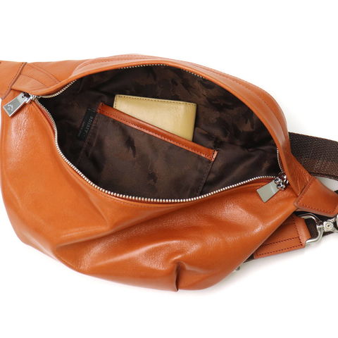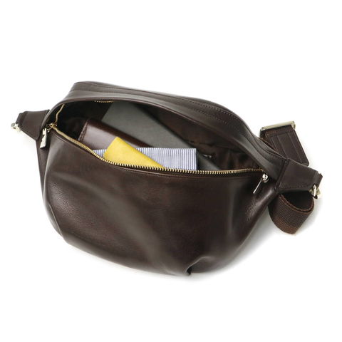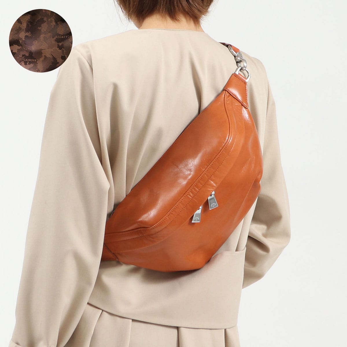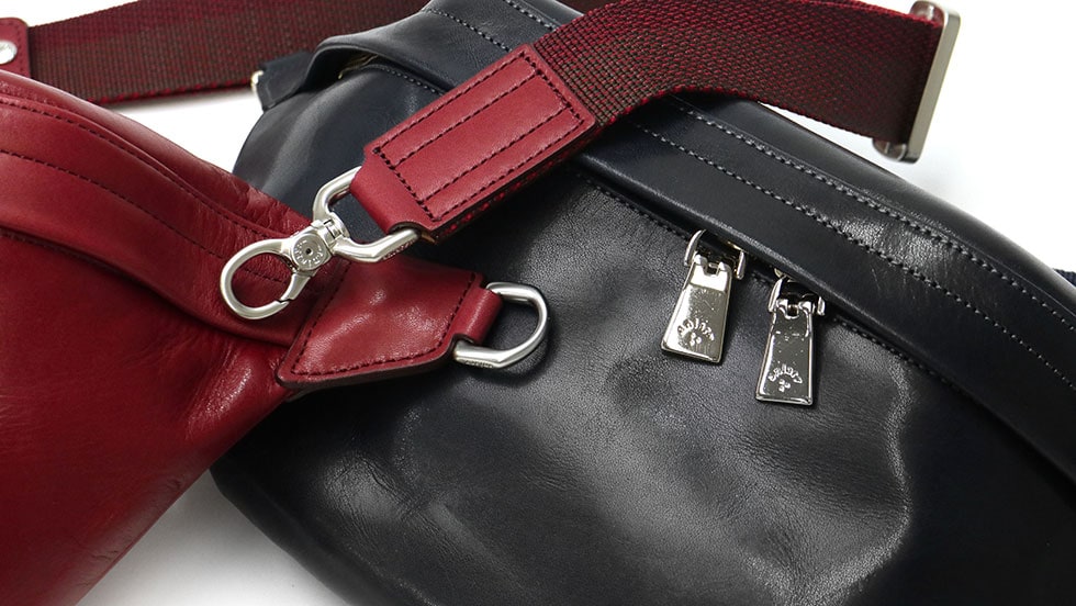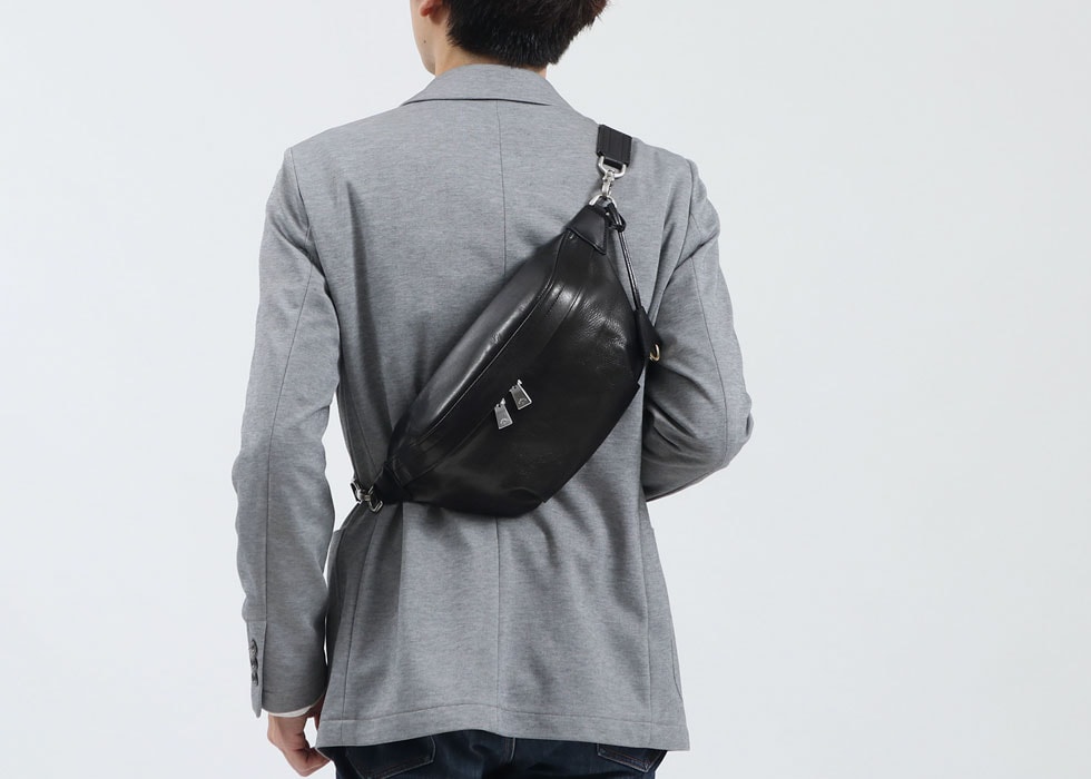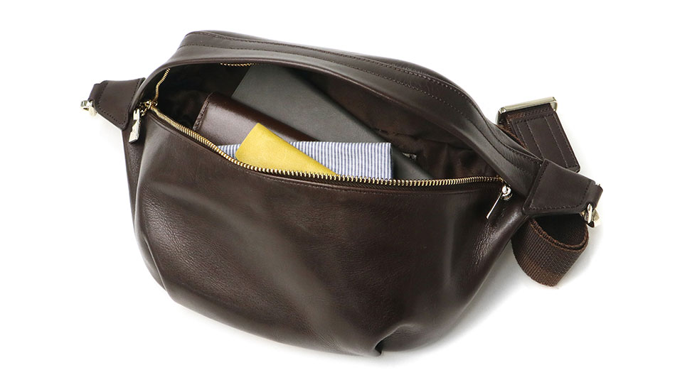 しっとりとした柔らかな質感が心地良い『Antique Leather』のボディバッグ。手ぶらでお出掛けするのに必要なアイテムが十分収まるサイズ感が魅力的で、実用面においても考え抜かれています。シンプルでありながら、メタルパーツとストラップが印象強く、存在感を放ちます。