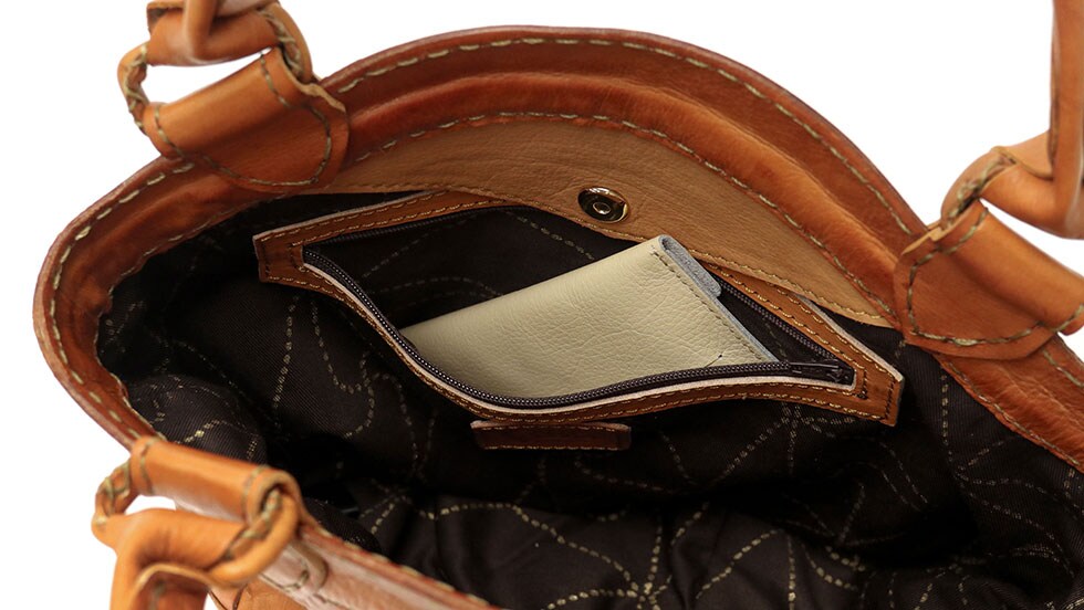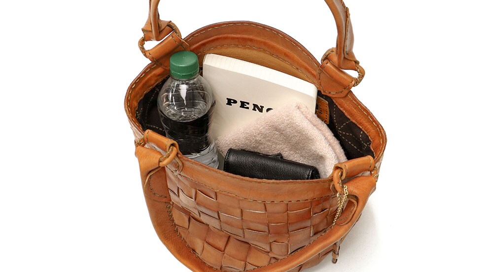 収納スペースはお財布やペットボトル、コスメポーチなど、お出かけの必需品が丁度良く収まるサイズ感。丸底なため見た目以上に大容量で、普段使いに活躍します。収納口はマグホックで留められるオープン仕様となっているため、開閉がしやすいだけでなく、荷物の出し入れもスムーズに行えます。