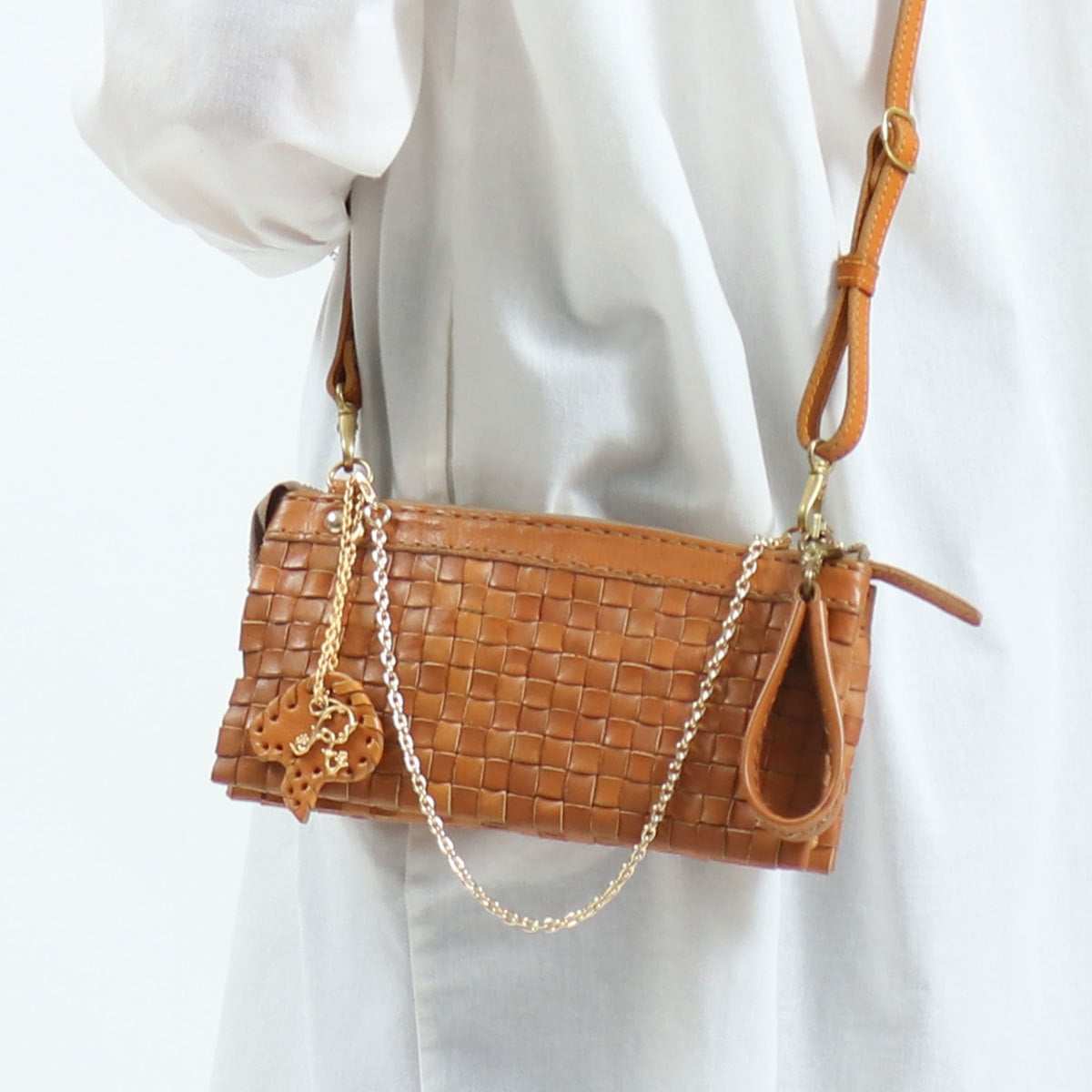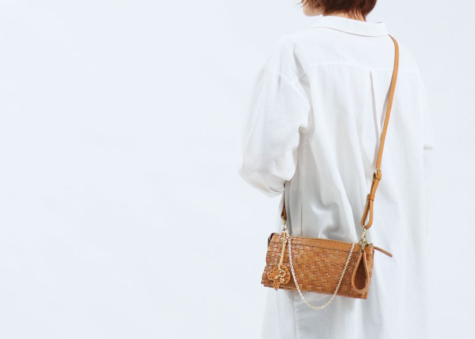 人気シリーズ『anyam nya robita/アニャムニャロビタ』の、落ち着いた色合いのレザーとゴールドチェーンがエレガントなショルダーバッグ。ショルダーストラップは着脱式なので、使用シーンに合わせてハンドバッグ、クラッチバッグとしても使用可能。マルチなスタイルで使えて、コーディネートの幅が広がります。