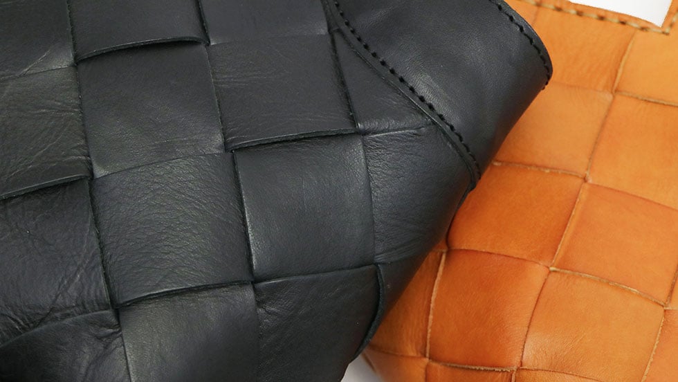 熟ヌメ革を一枚一枚手染めした後、革を裁断し、木型を使って丁寧に編み上げたメッシュレザー。一つ一つ心を込めた熟練の職人技で作られており、使い込むほどに増していく風合いをお楽しみ頂けます。
