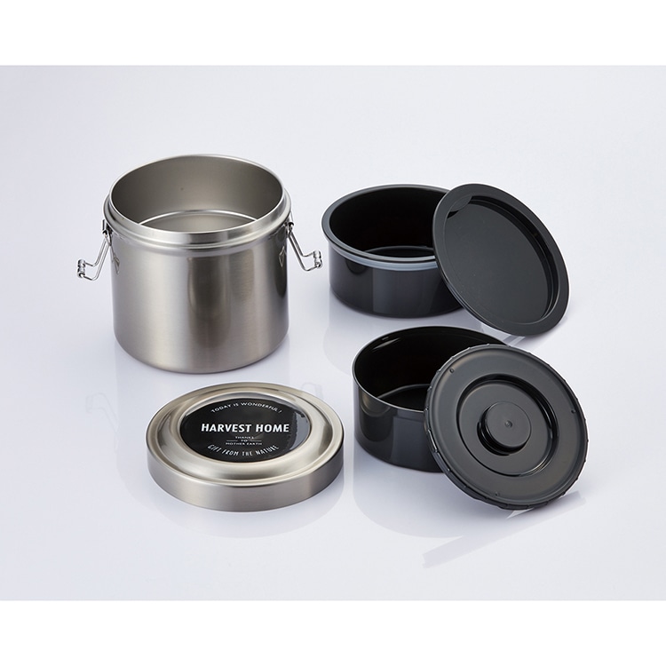 【素材】 本体・フタ/ステンレス鋼 (アクリル樹脂塗装)、止め具/ステンレス、容器(ごはん・おかず)・フタ(ごはん・おかず)/ポリプロピレン、パッキン/シリコーンゴム、底板/熱可塑性エラストマー