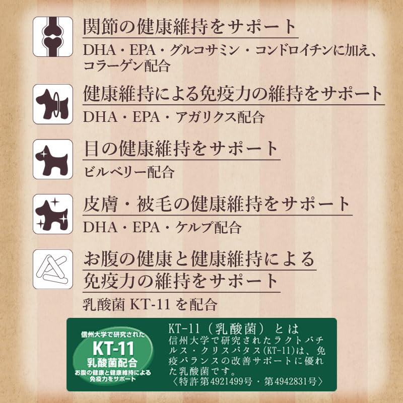■原材料名:肉類(鶏肉、チキンミール)、米糠、米粉、小麦粉、コーングルテンミール、ビートパルプ、動物性油脂、コーングルテンフィード、ビール酵母、酵母エキス、アマニ、魚油(DHA・EPA源)、オリゴ糖、パン酵母(セレン源)、グルコサミン、殺菌処理乳酸菌(KT-11株)、ビルベリーエキス、アガリクス粉末(β-グルカン源)、コラーゲン、コンドロイチン、ケルプミール、ミネラル類(食塩、炭酸カルシウム、塩化カリウム、硫酸亜鉛、硫酸銅、ヨウ素酸カルシウム)、ビタミン類(コリン、E、C、パントテン酸、B2、A、ナイアシン、イノシトール、B1、B6、葉酸、B12、ビオチン、K、D3)、アミノ酸類(DL-メチオニン、L-トリプトファン)