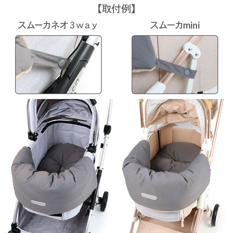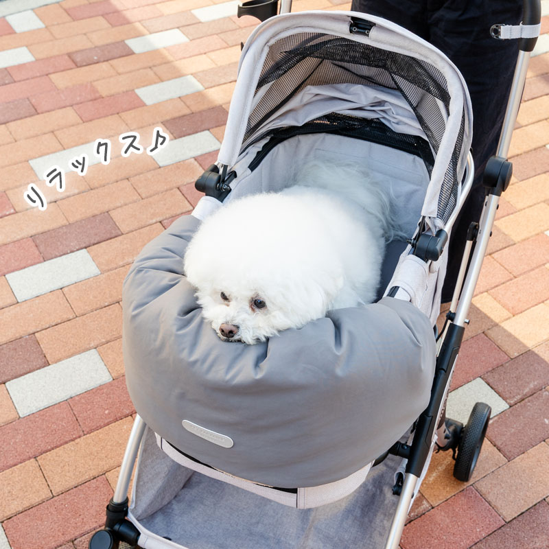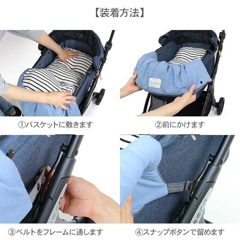 * バスケットの座面にクッションを敷き、顎乗せカバーを縁に掛けてください。