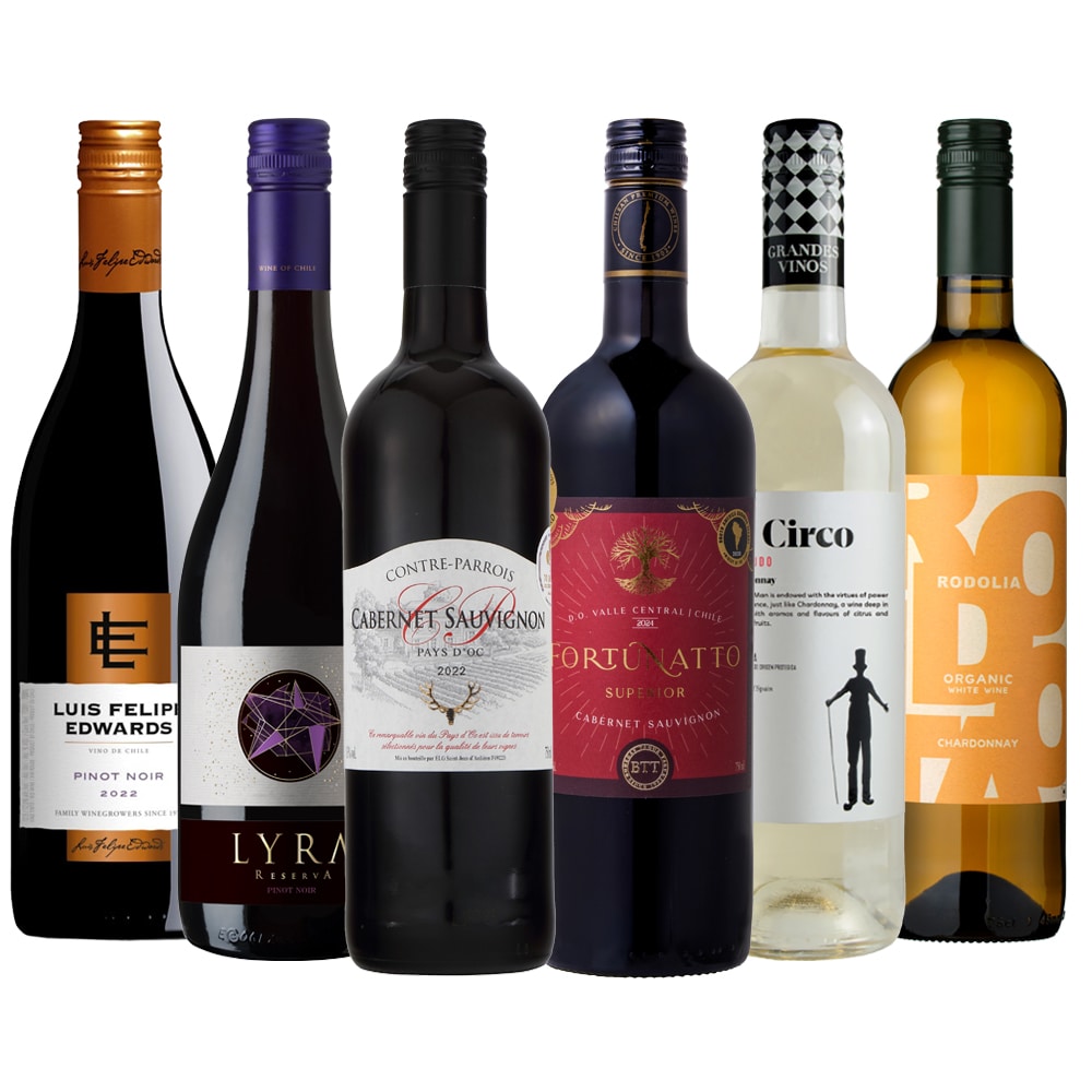人気品種のカベルネ・ソーヴィニヨン、ピノ・ノワール、シャルドネを楽しめる飲み比べ6本セット。