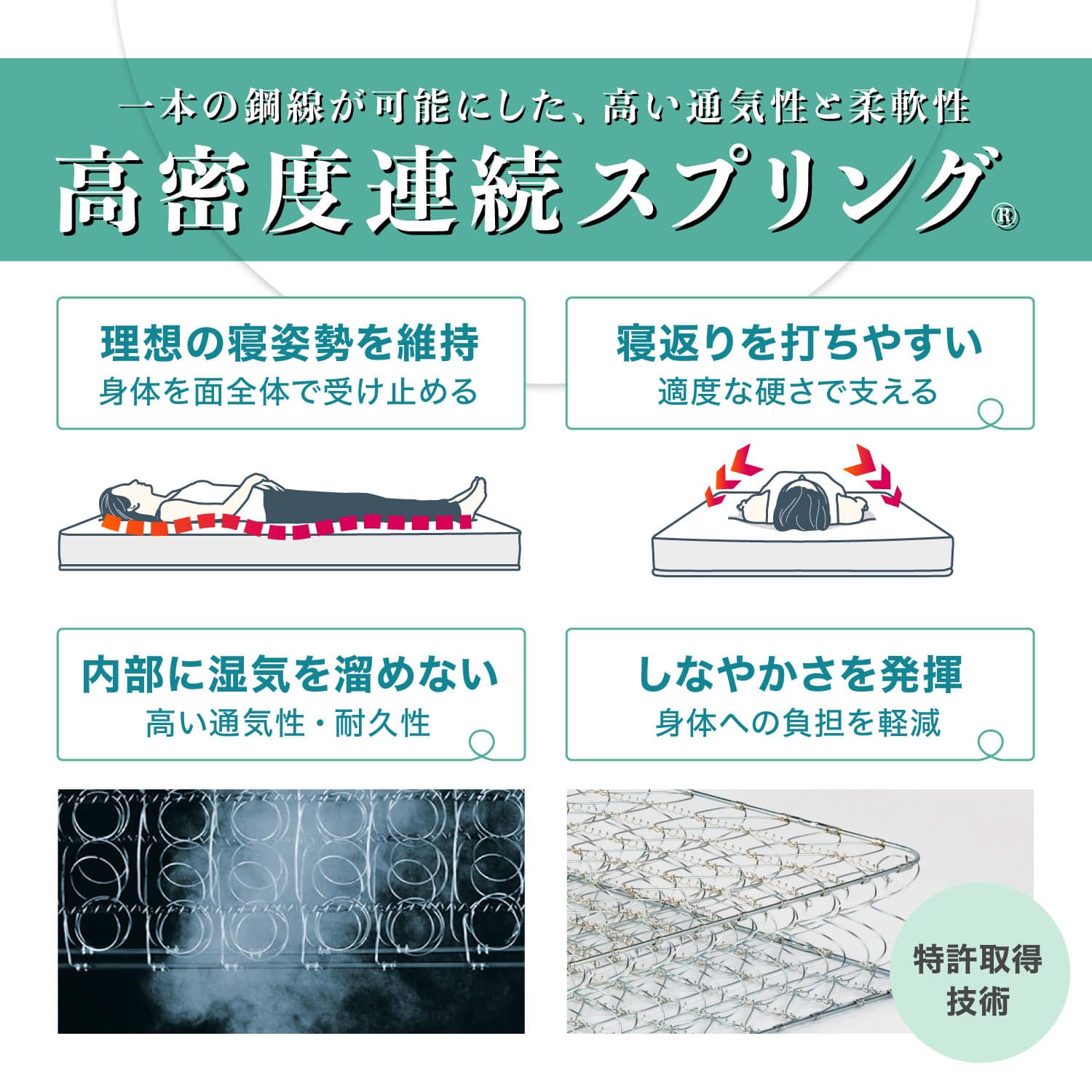 高密度連続スプリングは寝返りがしやすく、部分的な落ち込みが少ないのが特徴