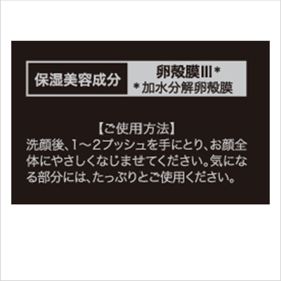 話題の卵殻膜をはじめ、植物幹細胞、プロテオグリカン、フラーレン、3種のヒアルロン酸、3種のペプチドなどの成分がしっかりと入っているので、化粧水、美容液、乳液、クリームを順番に重ねる必要なくこれ1本で同等のお手入れが完了します。