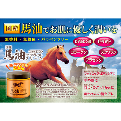 馬油とは、皮膚にすぐれた浸透力を持つ天然の馬の油です。肌の保湿、血行促進、マッサージ効果があり、やけど、ニキビ、アトピー、シミ、水虫、育毛、花粉症、妊娠線の予防など、様々な商品に使用されております。