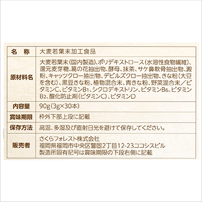 大麦若葉(国内製造)、ポリデキストロース(水溶性食物繊維)、還元麦芽糖、菊の花抽出物、酵母、抹茶、サケ鼻軟骨抽出物、沈澱粉、キャッツクロー抽出物、デビルズクロー抽出物、きな粉(大豆を含む)、黒豆きな粉、植物混合末、青きな粉、野菜金剛末/ビタミンC、ビタミンB1、シクロデキストリン、ビタミンB6、ビタミンB2、酸化防止剤(ビタミンC)、ビタミンD