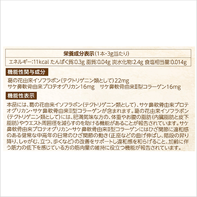 菊の花由来イソフラボン(テクトリゲニン類として):22mg、サケ鼻軟骨由来プロテオグリカン:16mg、サケ鼻軟骨由来Ⅱ型コラーゲン:16mg
