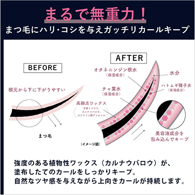 強度のある植物性ワックス(カルナウバロウ)が、塗布したてのカールをしっかりキープ。