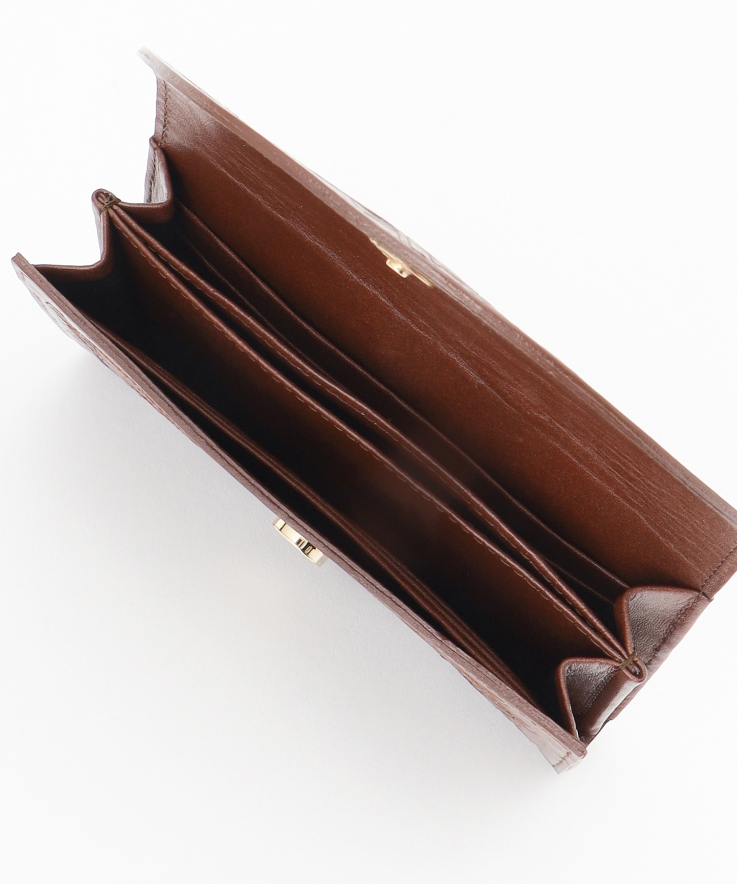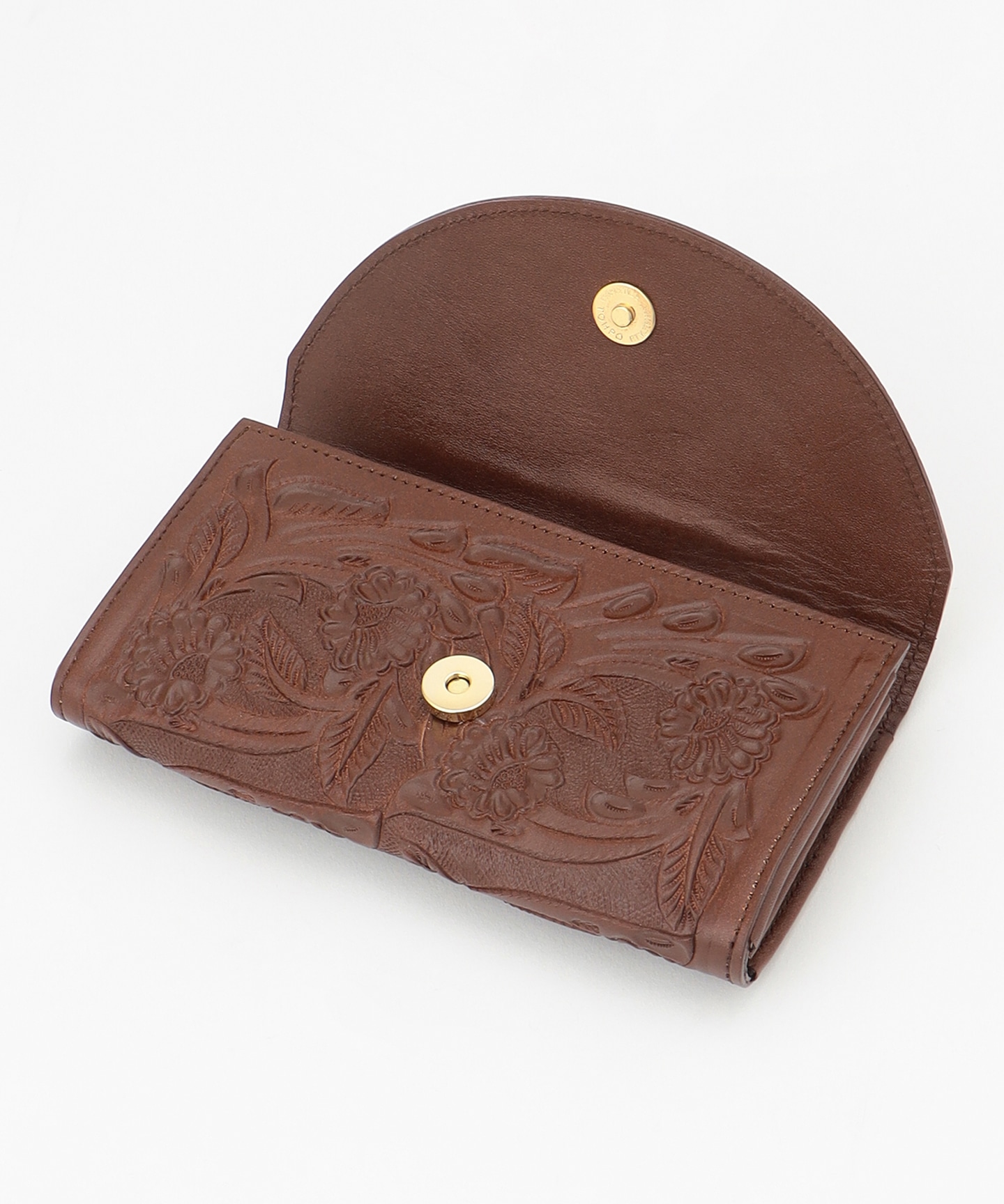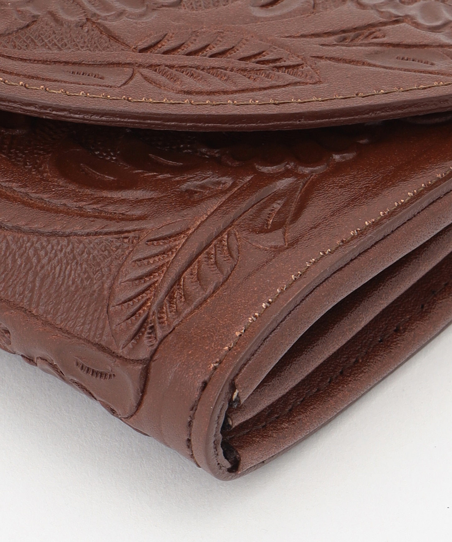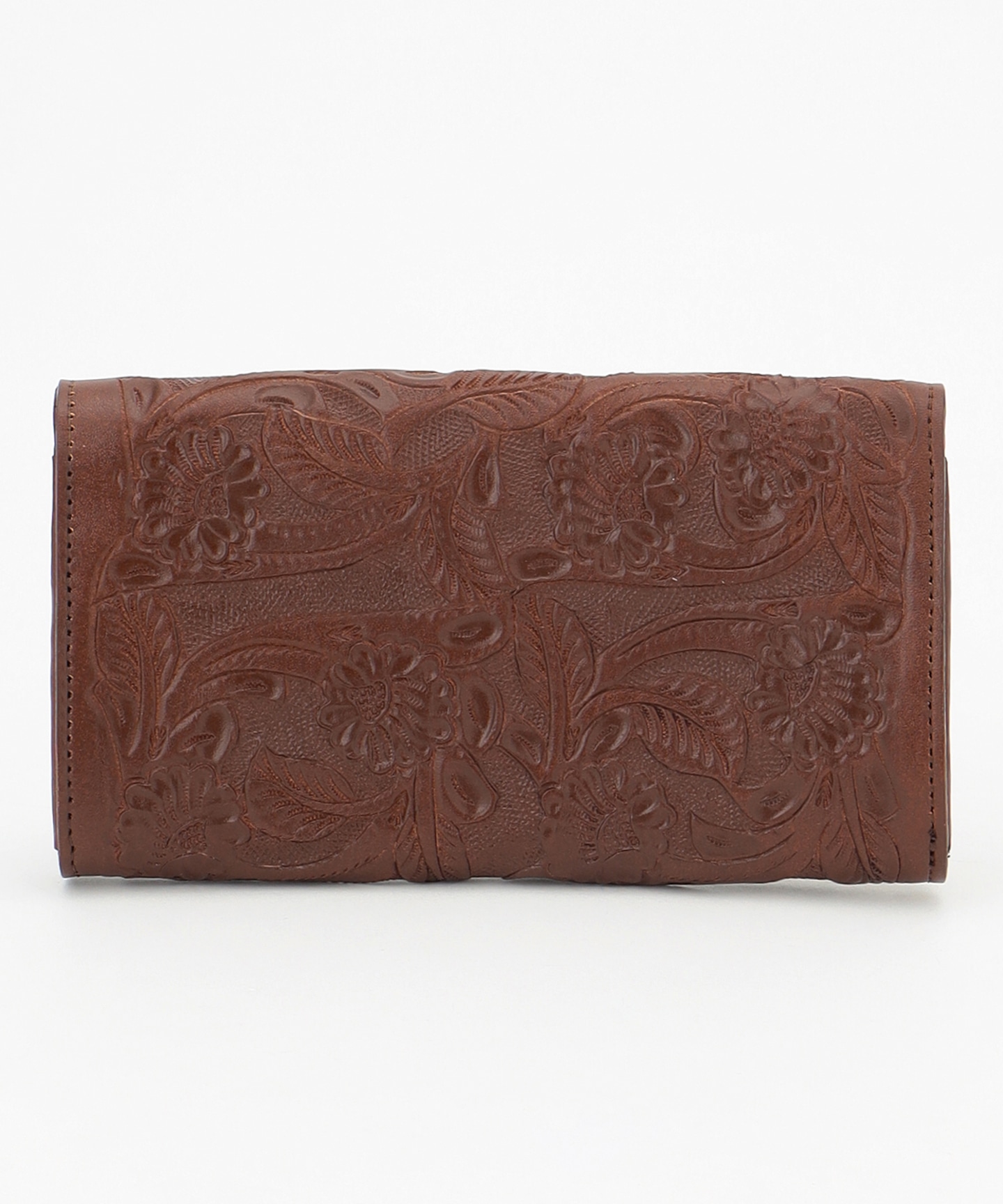 全体に草花を手彫りしたフラップ付きのロングウォレット。