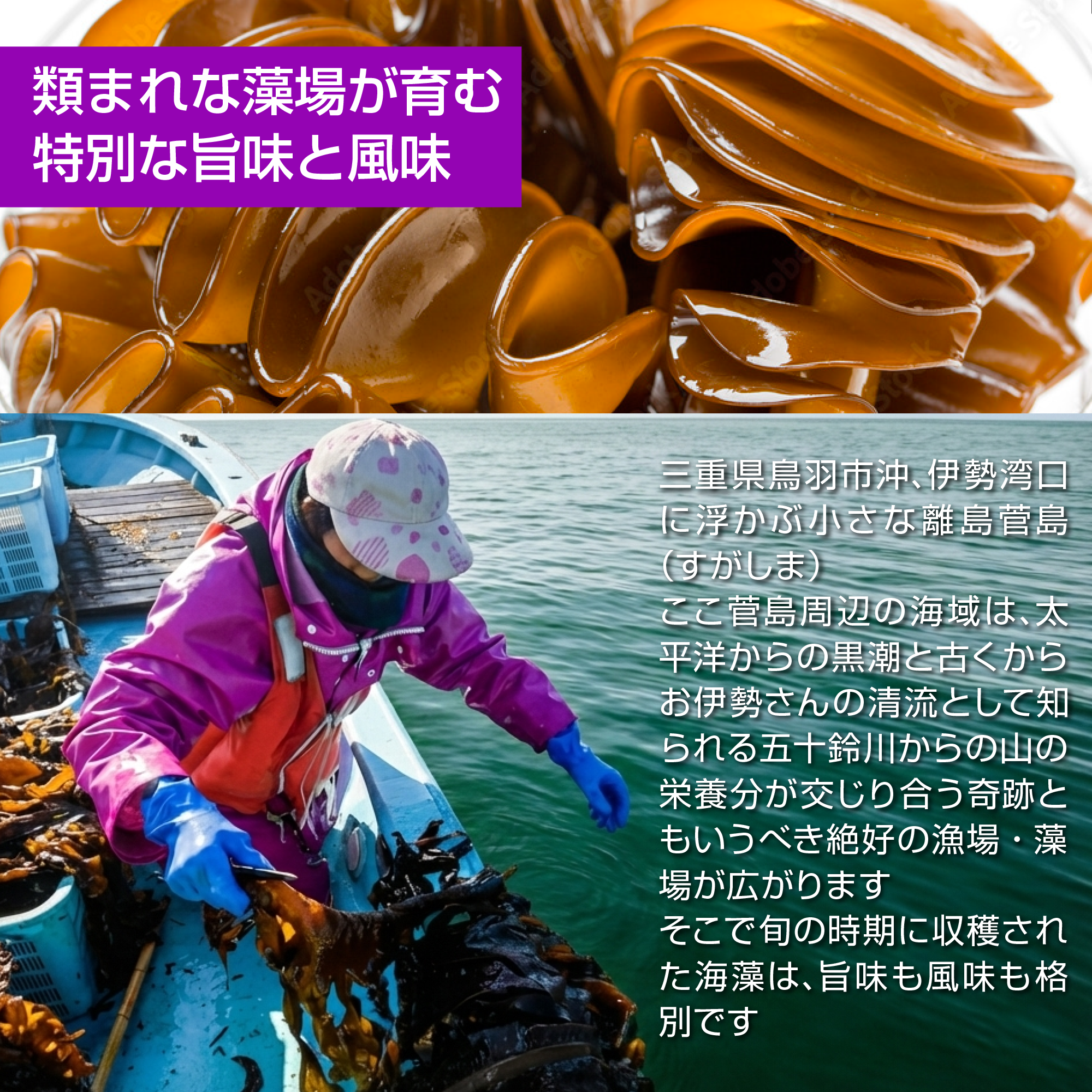 菅島沿岸で旬の時期に収穫された海藻は、味わい深く旨味も風味も格別です。「簡単に!お手軽に!始めよう海藻生活」をテーマに菅島で水揚げされた海藻を島内の工場にてベテランスタッフが手作業で安心・安全・丁寧に製造加工することを心がけ、全国のより多くの皆様にできるだけ新鮮な状態でお届けいたします。