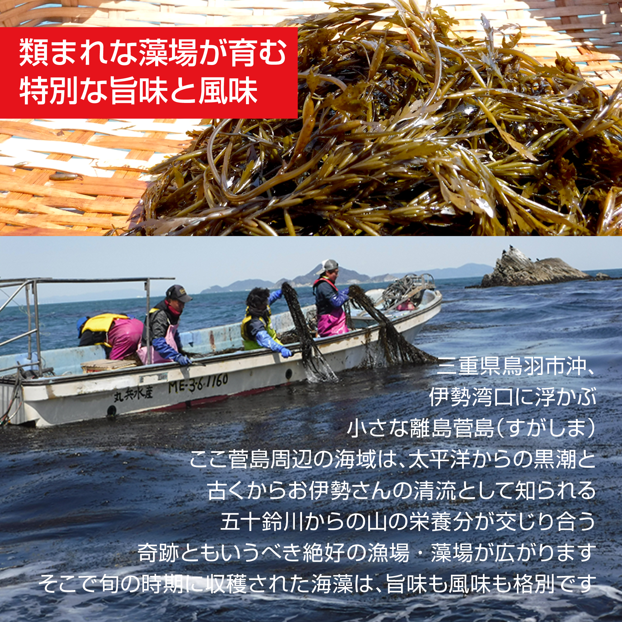 菅島沿岸で旬の時期に収穫された海藻は、味わい深く旨味も風味も格別です。