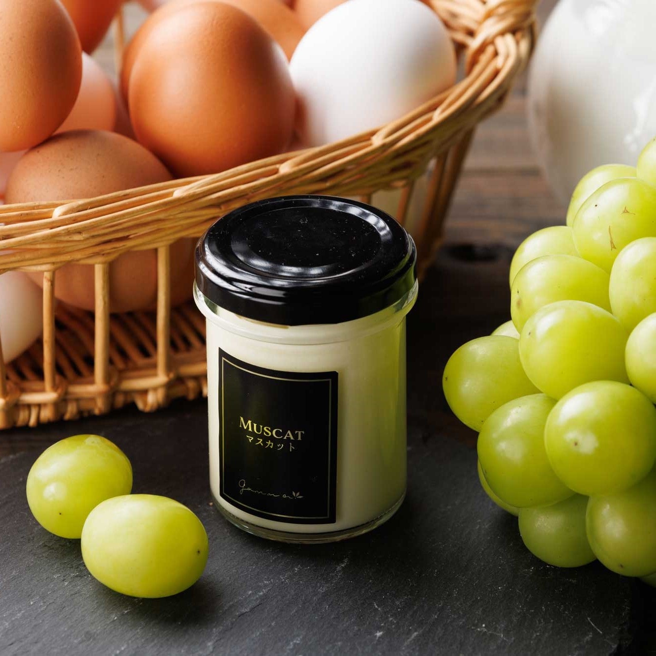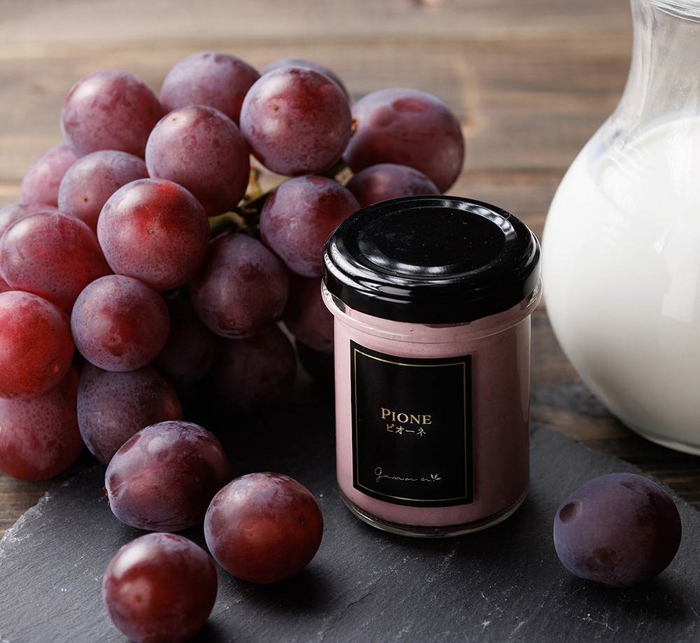 【ピオーネプリン】岡山県産のピオーネをたっぷり使用したプリンは、ピオーネと濃厚ミルクとの相性が絶妙なプリン。 全てのプリン生地の要である卵は、濃厚な味わいで臭みのない岡山県・美星町の「星の里たまご」を使用。