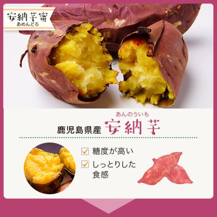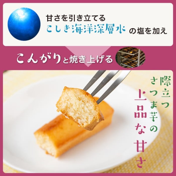 鹿児島県産の安納芋から作られた芋蜜を使用し、さらに薩摩川内市の甑島(こしきしま)の海洋深層水から作られた塩でお芋の甘さを引き立てました。さつまいもの風味と甘みが、口いっぱいに広がります。
