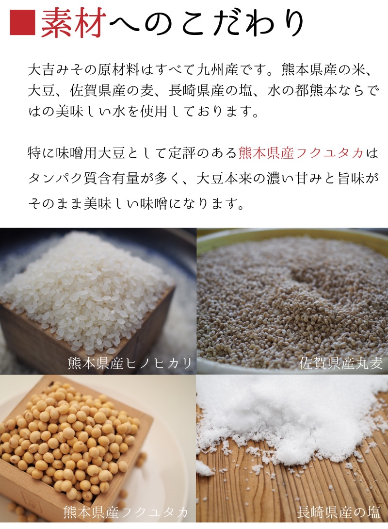 ●商品内容/2kg (500g x4個パック入り)大吉みそは、厳選した熊本県産の大豆、米、佐賀県産の麦、長崎県産の塩のみを使用し、昔ながらの製法で熟成させた味噌です。麦麹と米麹の合わせ味噌で味は甘めです。味噌汁はもちろん、煮物や炒め物にもよく合います。特に野菜たっぷりの味噌汁や豚汁にオススメです。毎日の食卓に寄り添い、身体に優しい自然な味わいをお届けします。
