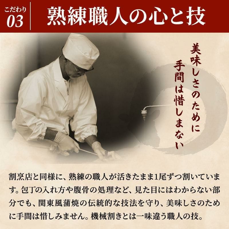 うなぎの本当の美味しさをお届けしたい。そんな想いから誕生した大五うなぎ工房。割烹店と同様に、熟練の職人が活きたまま1尾ずつ割いています。