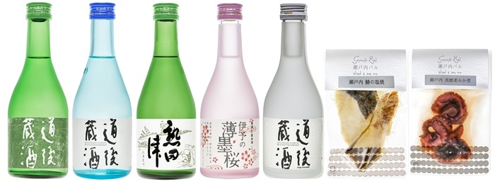 - 道後蔵酒 純米吟醸酒・上撰酒・生貯蔵酒・仁喜多津 伊予の薄墨桜・清酒 熟田津 上撰酒 各300ml×1本、瀬戸内 鰆の塩焼 60g×1袋、瀬戸内 真蛸柔らか煮 65g×1袋