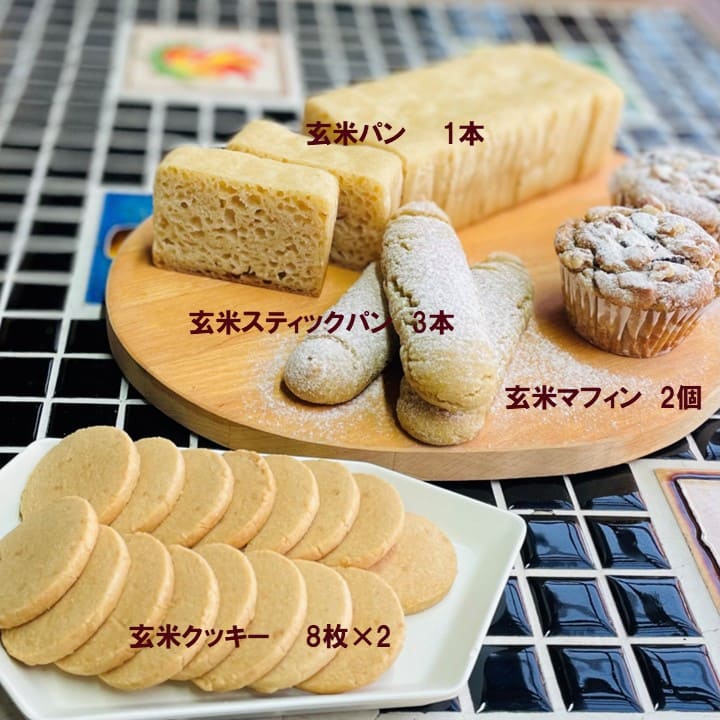 - 玄米パン 1本、玄米スティックパン 3個、玄米マフィン 2個、玄米クッキー 8枚×2セット