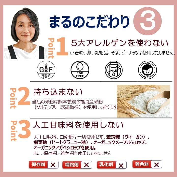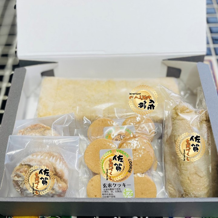 佐賀県産玄米(生産時農薬不使用)100%だけでお作りしたグルテンフリー・ヴィーガンスイーツセットです。玄米は当店で粉砕し一つ一つ手作りでお作りしております。生産者PRポイント