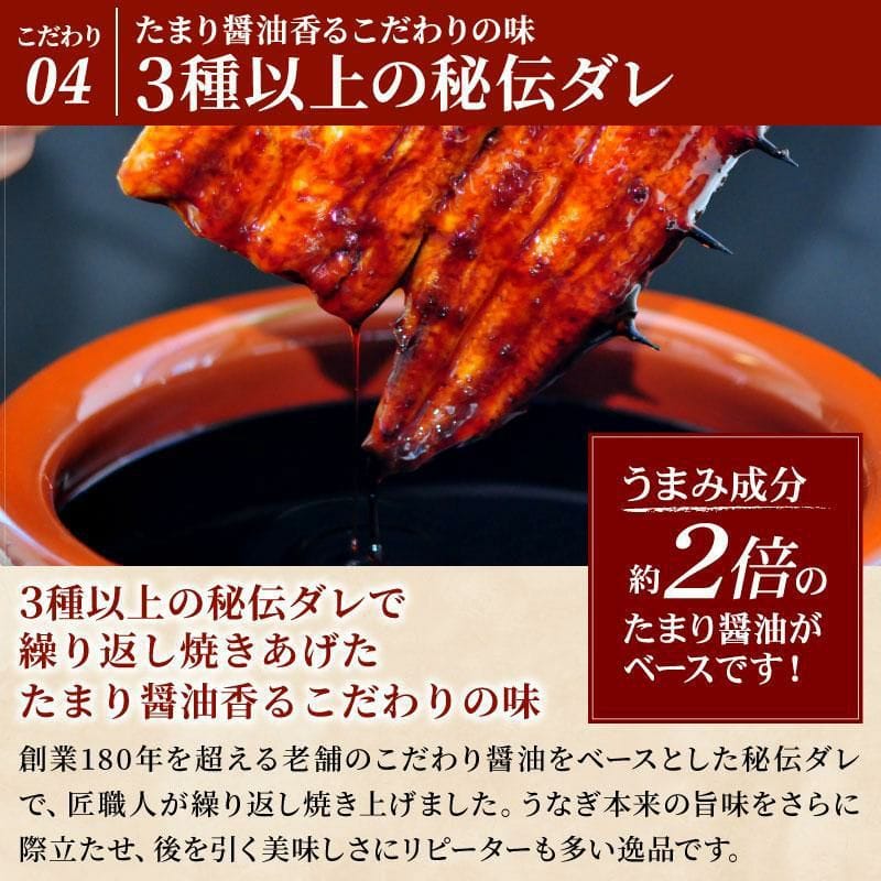 濃厚なうま味が特徴の創業180年を超す老舗の〔溜り醤油〕や日本最古のみりん醸造元の〔長期熟成本みりん〕など、厳選素材を使った秘伝のタレは、うなぎ本来の美味しさを引き出すよう独自調合しております。
