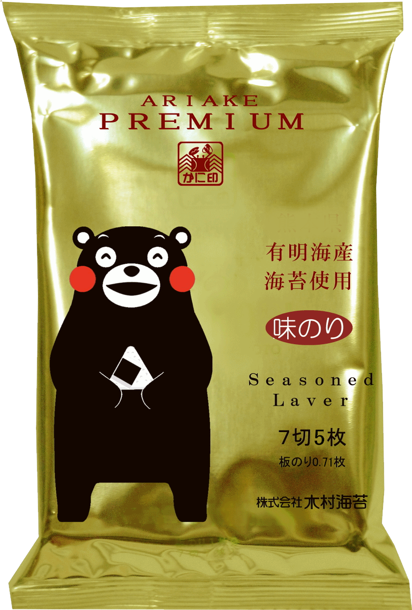 プレミアムな価格と品質で一般スーパーでは中々扱ってもらえない、ギフトクラスの海苔原料を使用した味付のりです。甘辛い味付けは子供さんにも好評で、金色に輝く「くまモン」がアイキャッチのお弁当のお供にも使いやすい個食パックです。