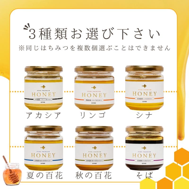 アカシア、リンゴ、シナ(菩提樹)、蕎麦、百花(夏・秋)など、複数の蜜源から選べる品種をご用意しています。