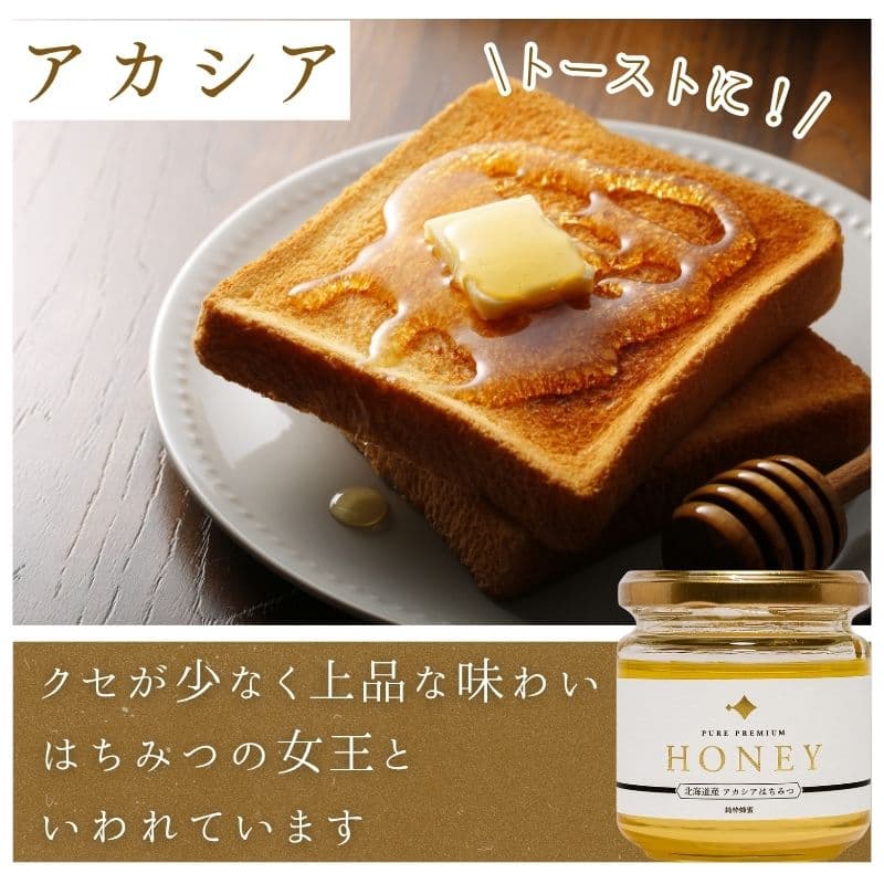 - アカシア蜂蜜:別名「はちみつの女王」。繊細で上品な甘さ、クセが少なく紅茶やヨーグルトにぴったり。