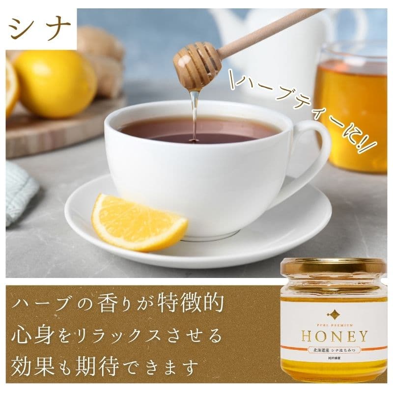 - シナ(菩提樹)蜂蜜:ハーブのような香りと清涼感。落ち着いた甘みで、ちょっと贅沢なひとときに。