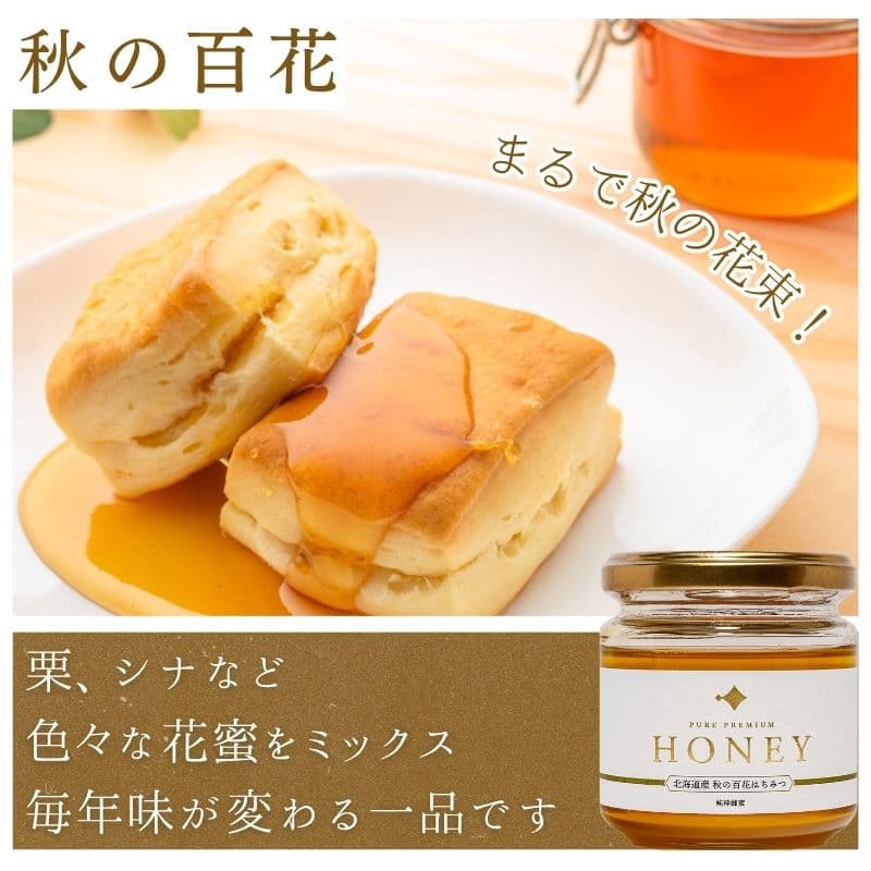 - 百花(夏/秋)蜂蜜:その年の複数の花から採れた蜜をブレンド。フルーティーな香りと深みのある甘さ。